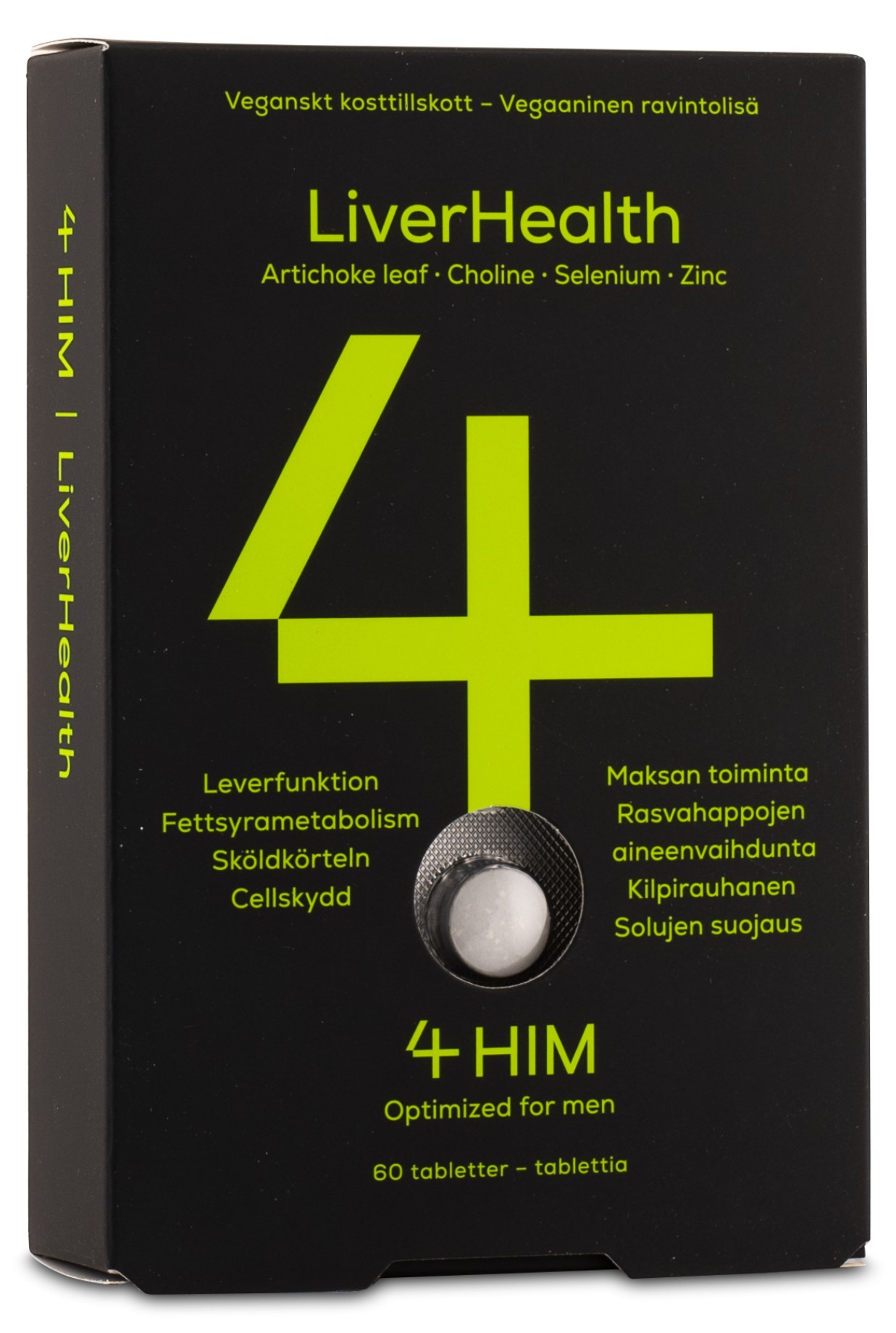 4HIM LiverHealth er et kosttilskud specielt tilpasset mænd. Det indeholder cholin, zink, selen og vitamin E, C og B6 samt ekstrakt af artiskokblade. Cholin støtter normal leverfunktion og fedtstofskifte. Zink bidrager til normal metabolisme af fedtsyrer og beskytter cellerne mod oxidativ stress sammen med vitamin E og C. Vitamin B6 fremmer normal protein- og glykogenmetabolisme, mens selen bidrager til normal skjoldbruskkirtelfunktion.