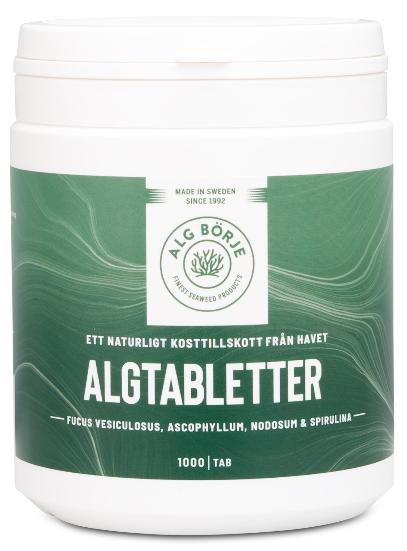 Algetabletterne fra Alg-Börje består af grisetang (Ascophyllum nodosum) og blæretang (Fucus vesiculosus), der er høstet i det hidtil upåvirkede hav ud for Islands nordvestlige kyst, samt af Spirulina planteplankton.