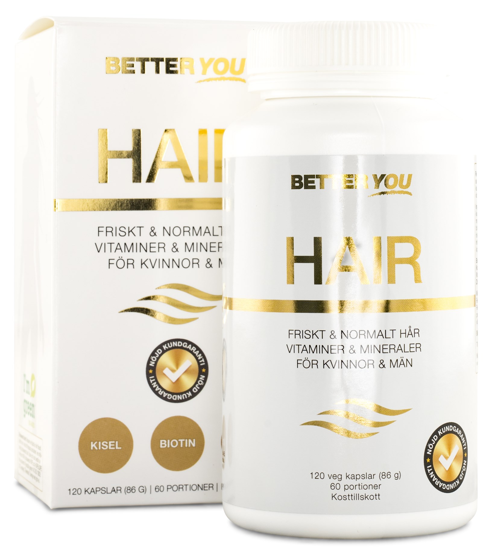 Better You HAIR er et eksklusivt kosttilskud, der er udviklet til at understøtte hårets sundhed. Tilskuddet indeholder udvalgte vitaminer, mineraler og aminosyrer, der på forskellige måder bidrager til normalt hår og hovedbund. Tilskuddet indeholder blandt andet biotin, zink og selen, som hjælper med at opretholde normalt hår, samt kobber, hvilket bidrager til hårets normale pigmentering. Det indeholder også naturligt svovl i form af MSM og aminosyren L-cystein, der begge er naturlige bestanddele i håret. Derudover indeholder Better You HAIR hele næringsstofekstrakter fra bambus, der er naturligt rige på kisel. Kisel bidrager til dannelsen af kollagen, der er en vigtig byggesten i hår, hud og negle.