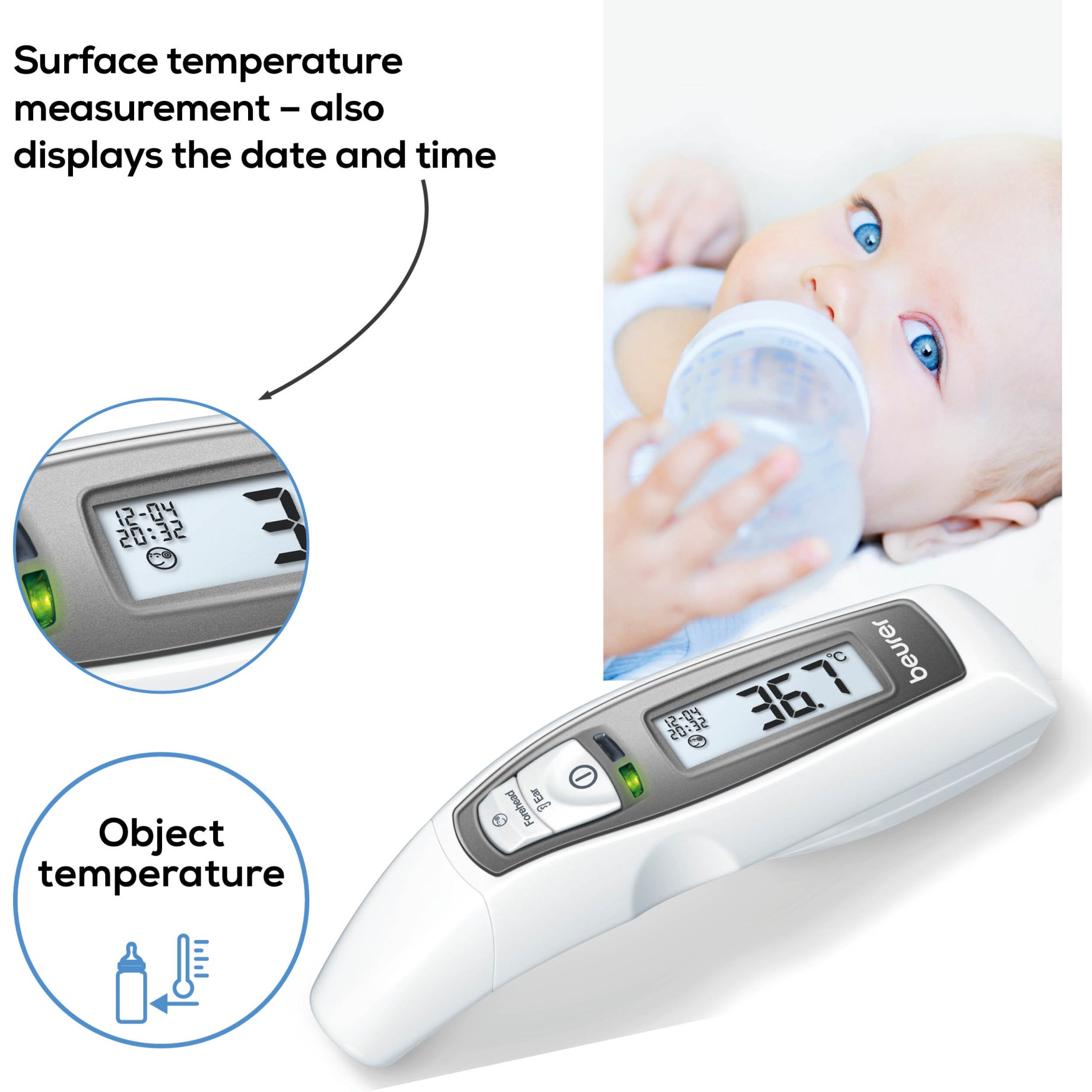 Beurer multifunktionelle termometer FT65 er et digitalt termometer til hele familien. Et meget hurtigt og fleksibelt termometer, der kan måle på flere forskellige måder. Bare placer målesensoren på panden, i øret eller en hvilken som helst overflade, så får du svar på få sekunder. Du kan også bruge termometeret til at måle temperaturen på andre objekter, f.eks. En babyflaske til måling af væsketemperatur. Beurer multifunktionelle febertermometer viser tid og dato og har et klart display og gemmer op til ti målinger. Termometeret slukker automatisk og har en funktion til feberalarmer.