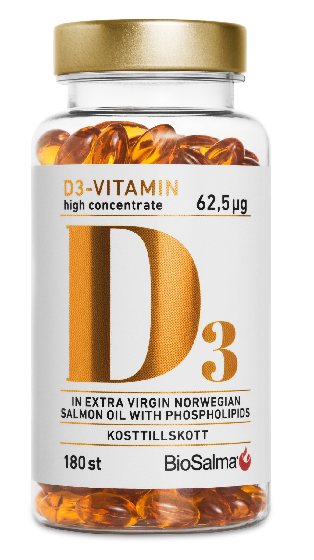 BioSalma D3-vitamin 62,5 µg High Concentrate indeholder en høj dosis D-vitamin per kapsel. D-vitaminet er opløst i naturlig lakseolie, som indeholder fosfolipider, for at forbedre optagelsen i kroppen af det fedtopløselige D-vitamin. D-vitamin bidrager til at vedligeholde normale knogler og immunforsvarets normale funktion. Kapslerne er små og lette at sluge.