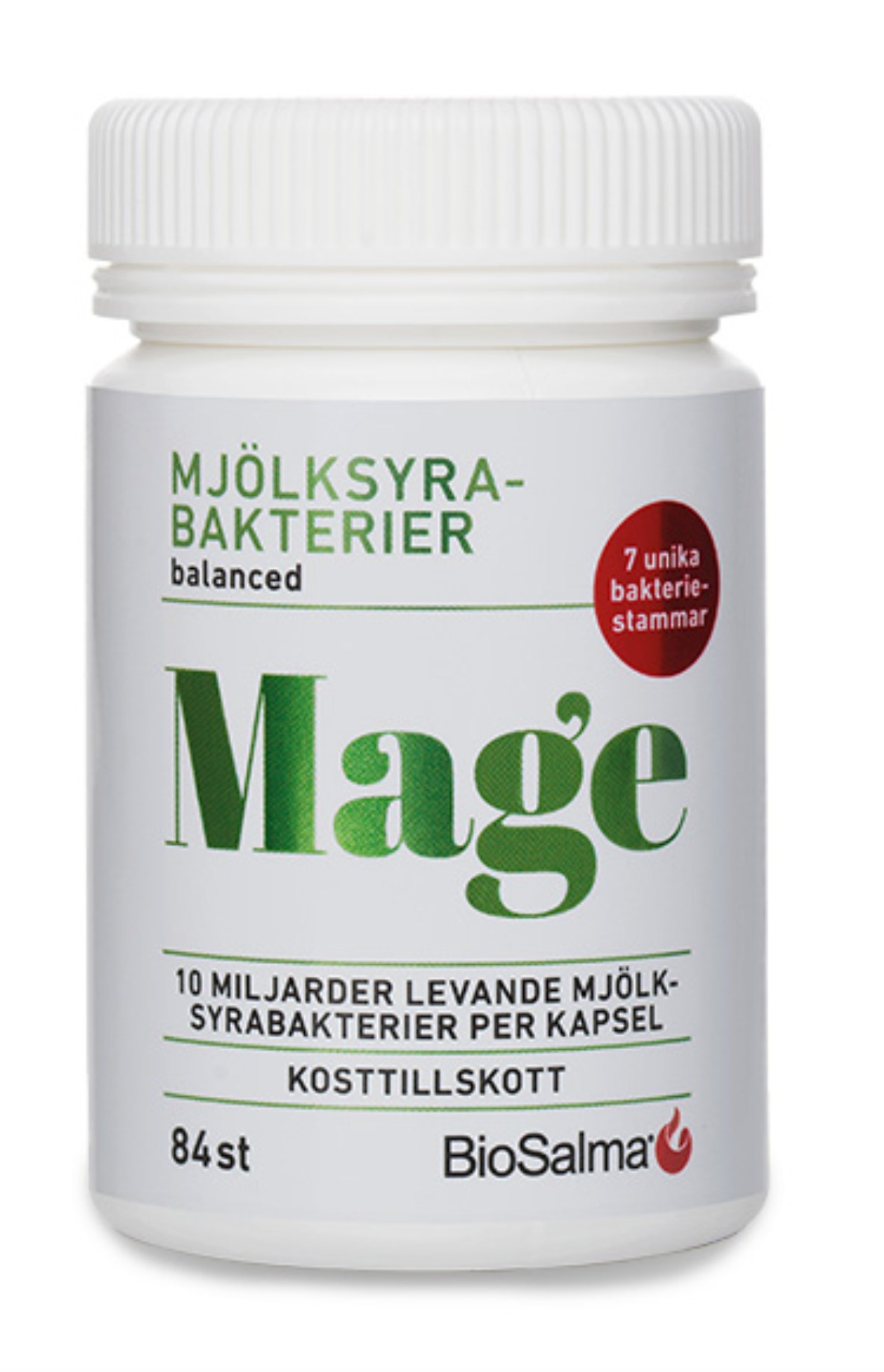I BioSalma Mælkesyrebakterier 7 stammer får du 10 milliarder mælkesyrebakterier i hver kapsel fra syv nøje udvalgte stammer. Mælkesyrebakterier findes naturligt i kroppen og i for eksempel yoghurt, kimchi, surkål og andre fermenterede fødevarer. Kapselskallen er mavesyreresistent, så mælkesyrebakterierne kan passere gennem mavesækken og hele vejen til tyndtarmen uden at blive påvirket af mavesyren.