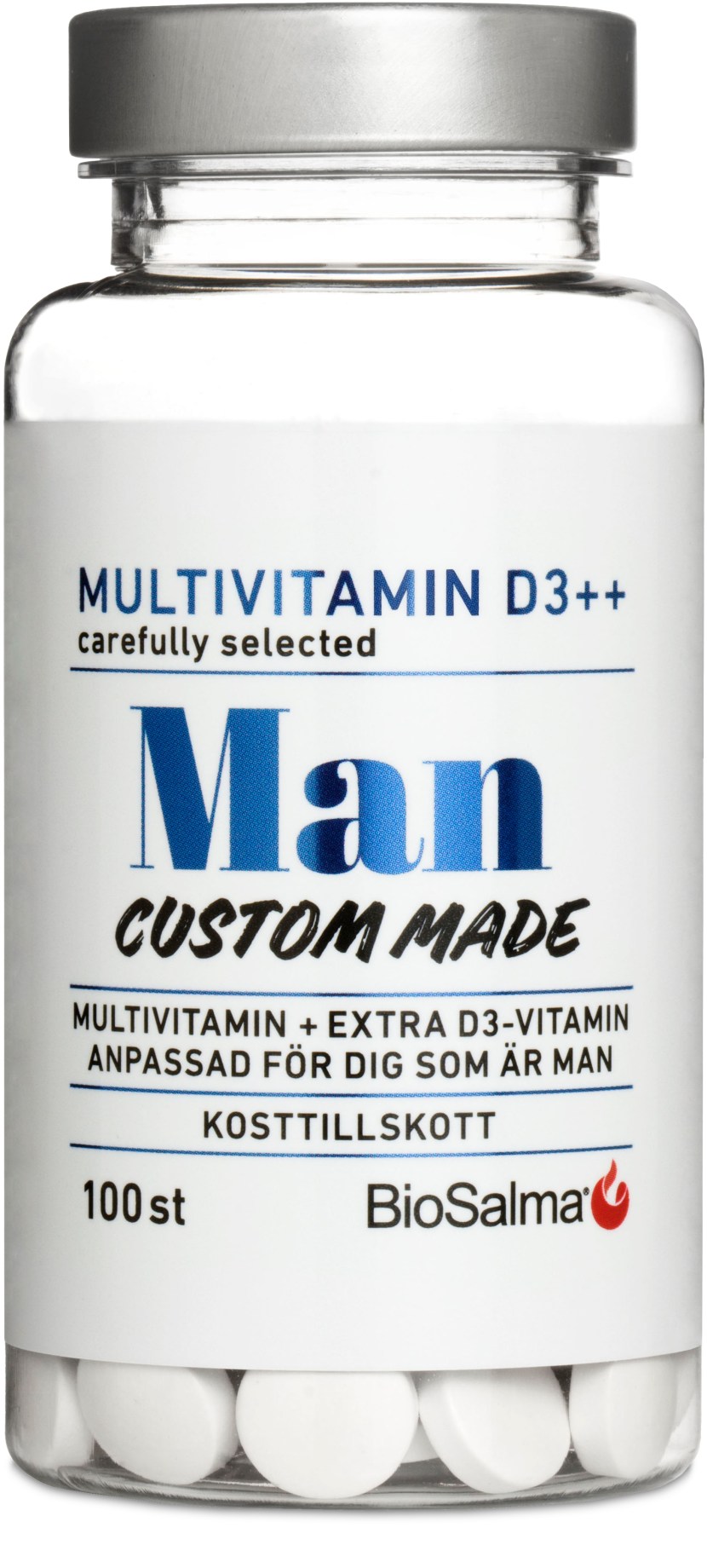 BioSalma Multivitamin Mand D3-vitamin++ indeholder vitaminer og mineraler til at dække mandens behov. Med 1-2 tabletter om dagen kan du sikre dit daglige indtag af vitaminer og mineraler. Det ekstra D-vitamin gør tilskuddet særligt relevant for os i Norden.