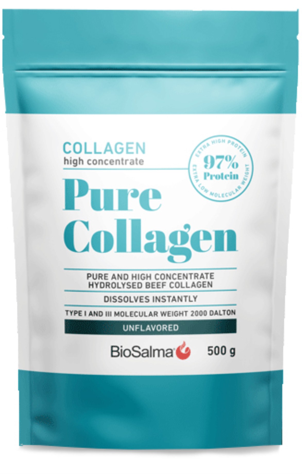 BioSalma Pure Collagen 100% indeholder rent kollagen, som er fremstillet ved enzymatisk hydrolyse. Den særlige proces giver små kollagenpeptider (under 2000 dalton). Proteinkoncentrationen er hele 91 % og består af 85 % type I-kollagen og 15 % type III. Kollagenet har en neutral smag og kan blandes i både varme og kolde drikke og opløses hurtigt.