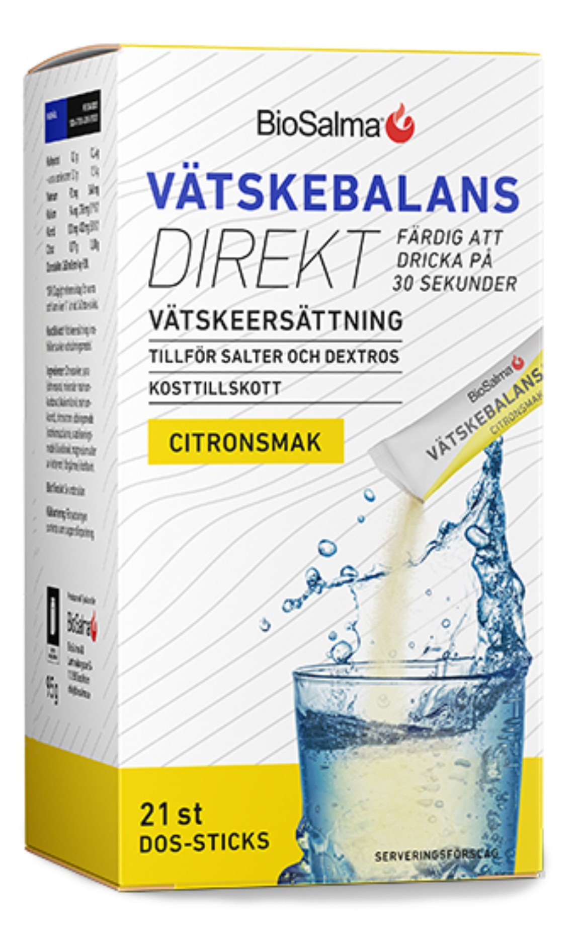 BioSalma® Væskebalance Direkt er en praktisk væskeerstatning, der både tilfører væske og salte. Den leveres i praktiske sticks, som gør det nemt at tage med og bruge, når behovet opstår. Pulveret opløses hurtigt i vand – på cirka 30 sekunder – så du hurtigt kan blande din drik. Findes i smagene hindbær og citron.