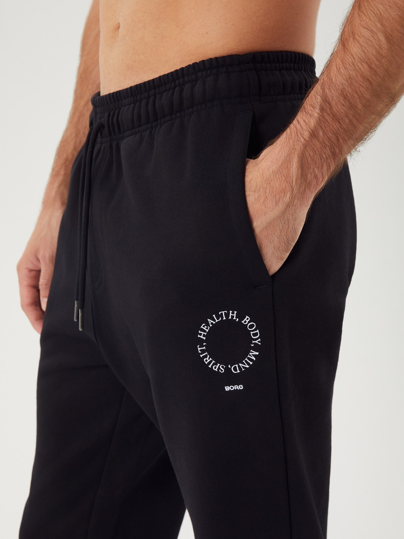 Björn Borg Oversized Sweatpants er et par behagelige bukser med en pasform, der er oversize. Fremstillet i en blød blanding af bomuld og genanvendt polyester med børstet fleece indvendigt. Bukserne har en justerbar talje med snøre og praktiske lommer foran på benene. Et diskret grafisk print på benet giver et stilfuldt og smart touch. De perfekte sweatpants året rundt, i fitnesscentret eller til en afslappet hviledag!