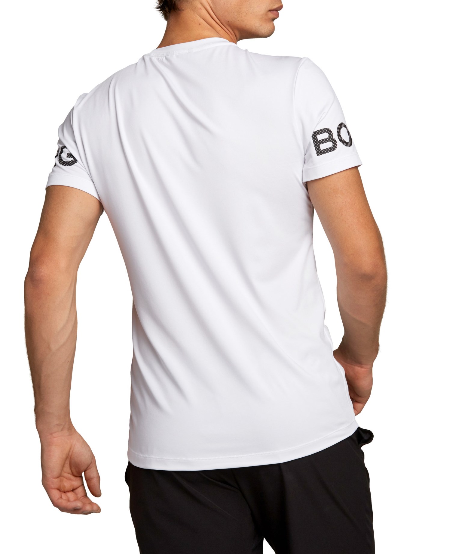 Björn Borg T-Shirt er en t-shirt er en behagelig t-shirt, der er velegnet til alle former for træning men også til hverdag. En tynd, blød og strækbar t-shirt, lavet af genanvendt polyester og elastan. Åndbart og hurtigttørrende materiale. Med funktionelle detaljer som lidt længere talje og ærmer, der er placeret lidt højere, får du stor bevægelsesfrihed og du kan bruge den til hård træning.