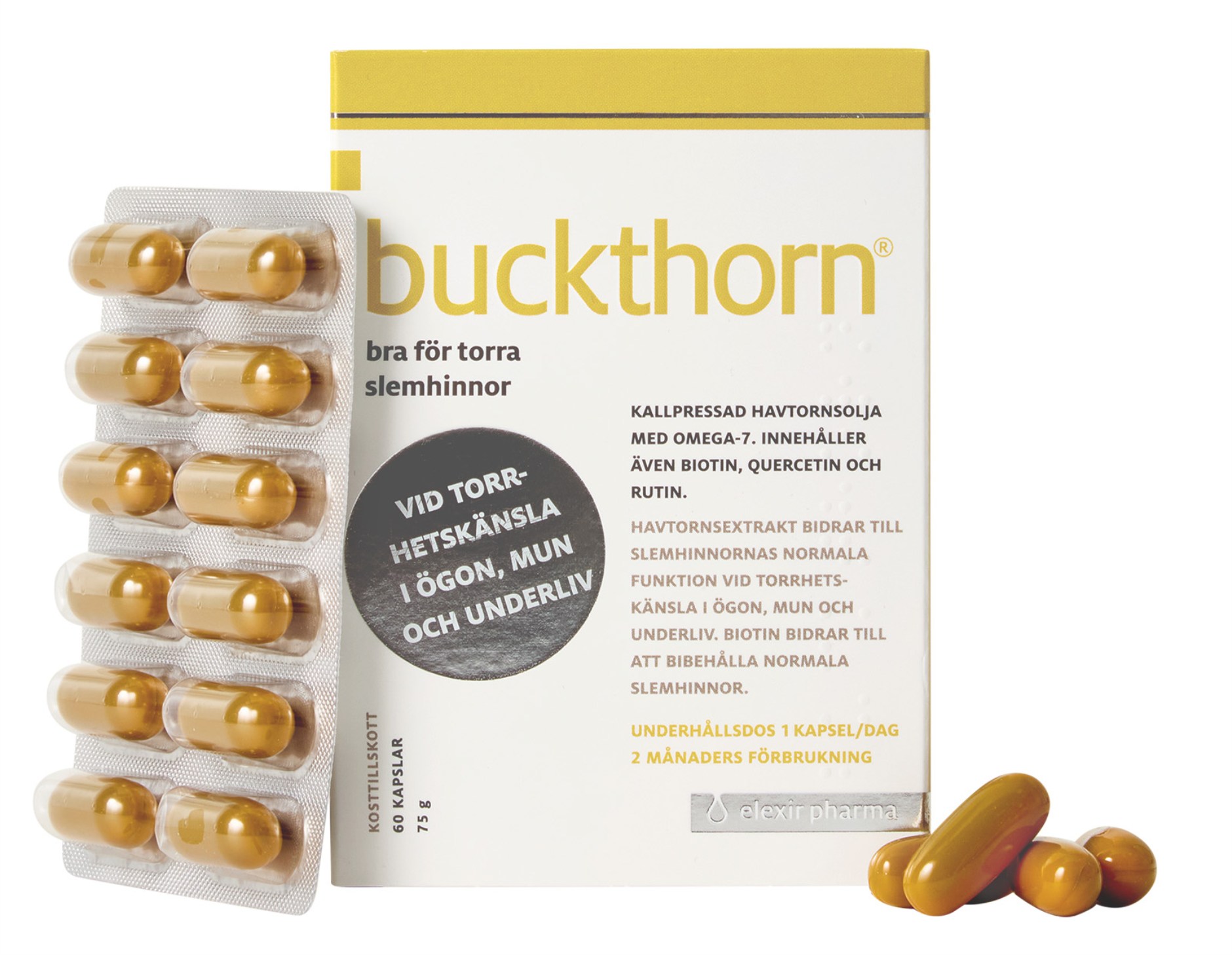 Buckthorn koldpresset havtorneolie er rig på omega-fedtsyrer og indeholder også biotin, quercetin og rutin. Havtorn indeholder næringsstoffer som bidrager til slimhindernes normale funktion og modvirker tørre øjne, mund og luftvej. Havtornekstrakt er også en naturlig kilde til de flerumættede fedtsyrer, omega-3 og -6, samt de enkeltumættede fedtsyrer, omega-7 og -9.