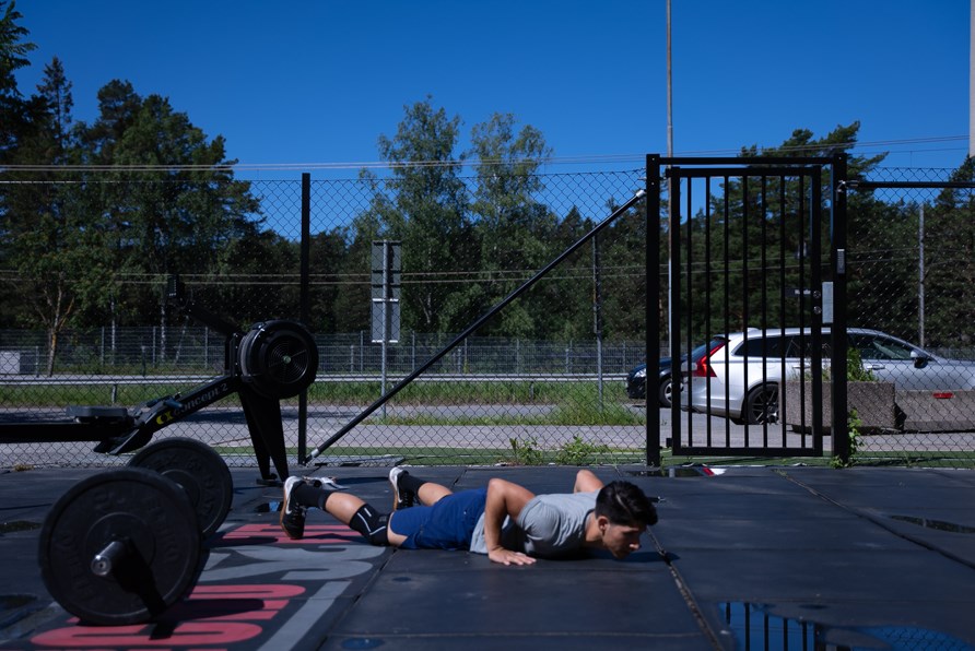 • For en sværere og hårdere variant, sænk brystet kontrolleret ned som en armbøjning til gulvet.
