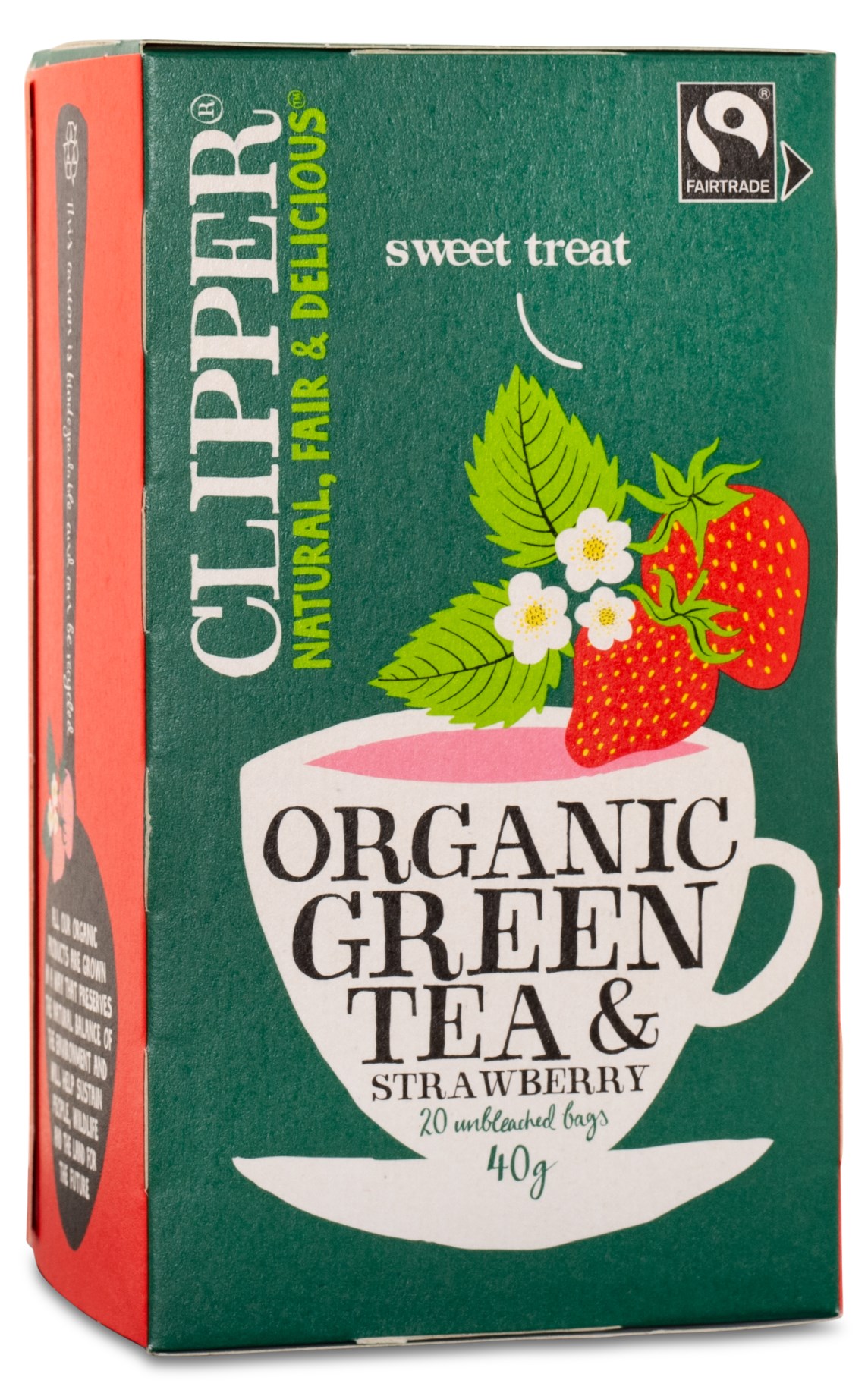 Clipper Tea Green Tea & Strawberry er en forfriskende grøn te med jordbærsmag. Den lette te har tilsat stykker af jordbær for en naturlig og god smag. Grøn te har antioxidante egenskaber og fremmer også fordøjelsen. Nyd en kop økologisk og Fairtrade mærket Clipper Tea Green Tea & Strawberry i løbet af dagen, eller når du har lyst til noget varmt og naturligt sødt.