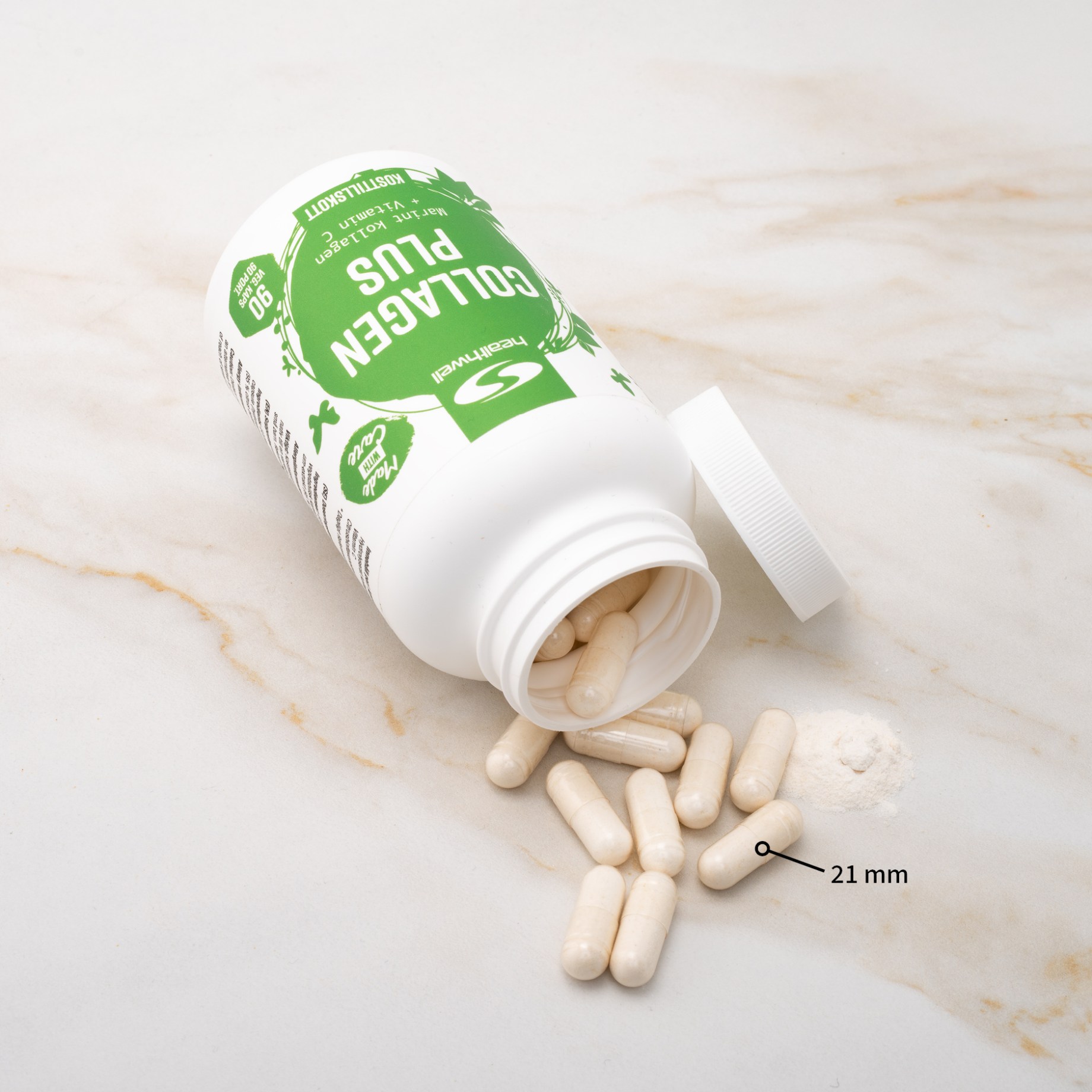 Healthwell Collagen Plus indeholder hydrolyseret kollagen af marin oprindelse. Kollagen er et interessant stof, som findes naturligt i kroppens bindevæv, hvor det hjælper med at opbygge strukturen i led, brusk, hud, hår og negle. Collagen Plus er en smart måde at tilføre ekstra kollagen via kosten, ikke mindst hvis du træner hårdt og har en høj belastning på leddene. 1-2 kapsler om dagen er nok til et tilstrækkeligt indtag af kollagen.