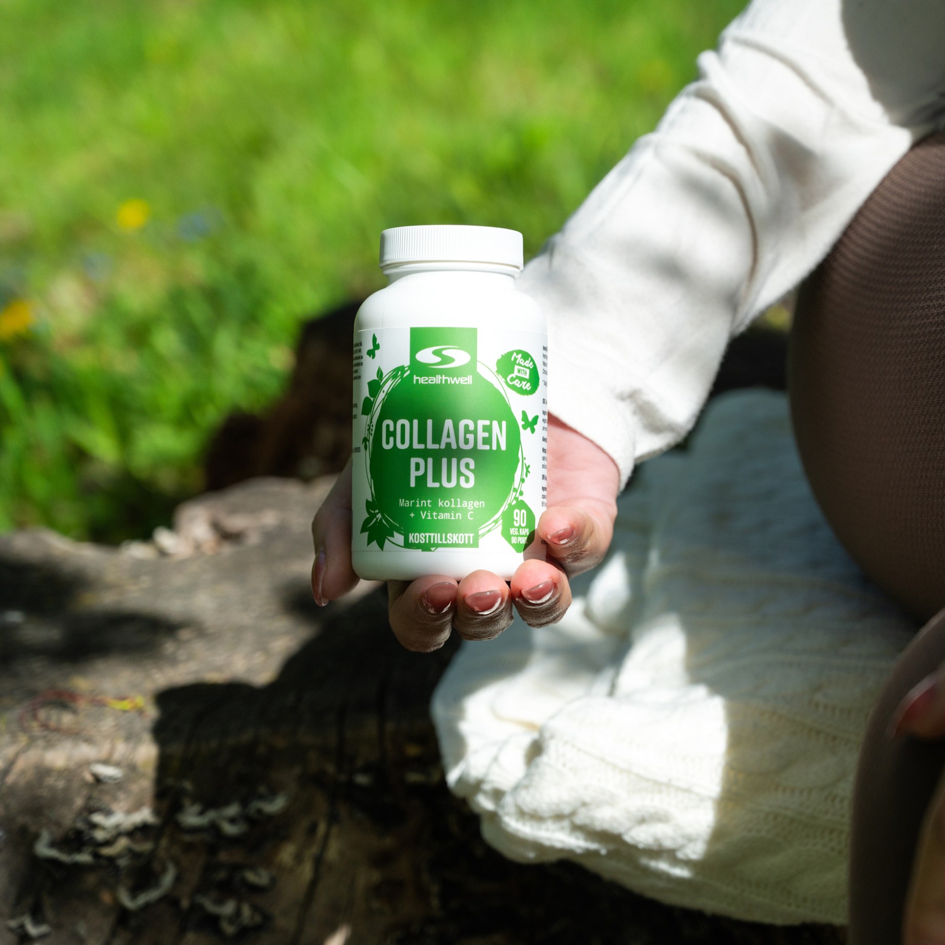 Et kosttilskud med kollagen er en nem måde at få mere kollagen end det, du får gennem resten af kosten. Healthwell Collagen Plus indeholder hydrolyseret kollagen af marin oprindelse. Fiskekollagen anses af mange for at være en af de bedste kilder til kollagen og er desuden let for kroppen at optage. Marint kollagen er rig på glycin og prolin, som er vigtige aminosyrer for opbygningen af ledbrusk. Fordi kollagenet i Collagen Plus kommer fra marine kilder, kan det også spises af personer, som ikke spiser kød. Kollagen hentes ofte fra kødprodukter, hvilket gør, at vegetarer sjældent vil bruge det.