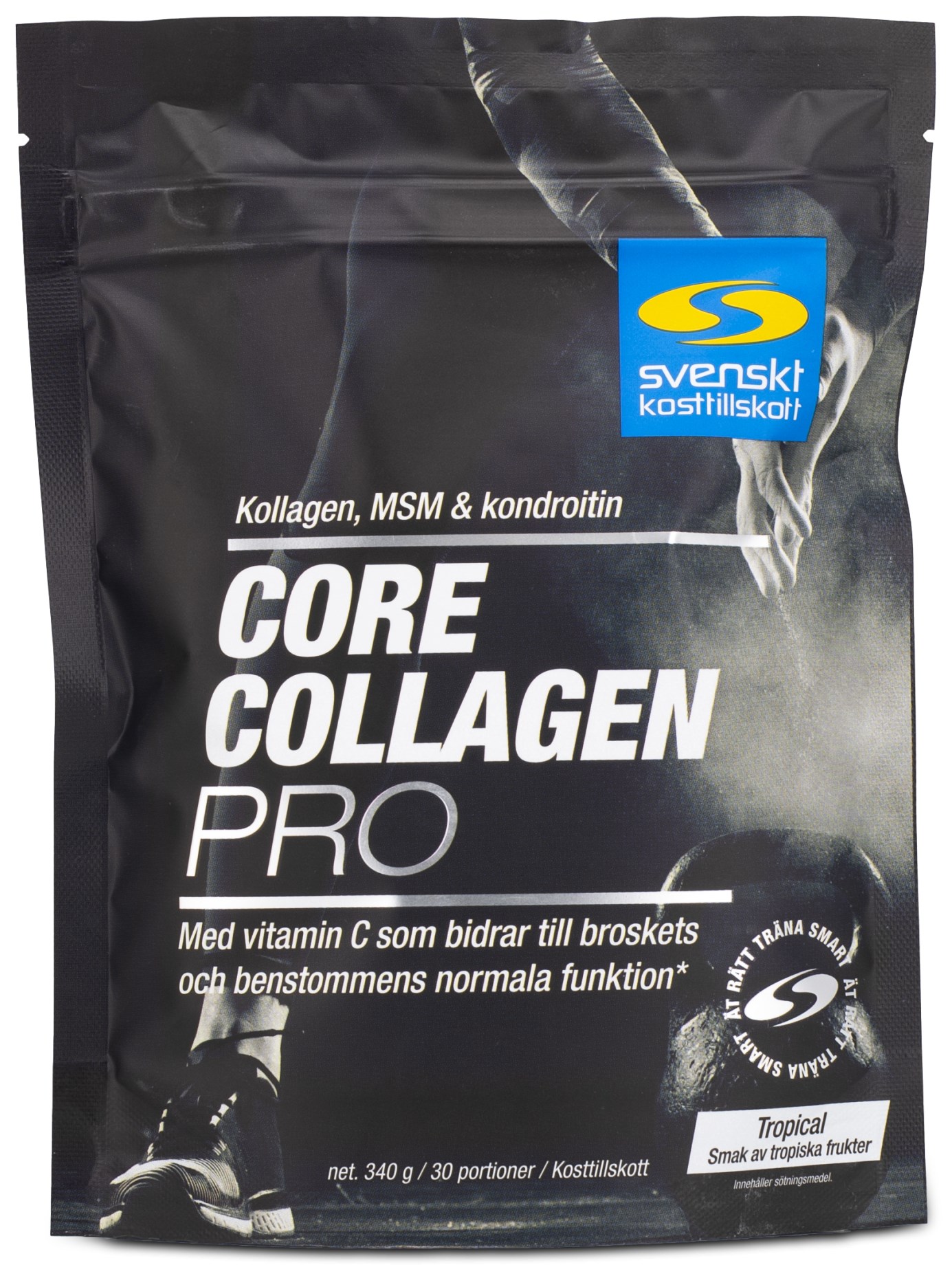 Core Collagen Pro er et unikt produkt, da det indeholder tre aktive ingredienser sammen med C-vitamin til bruskens og skelettets normale funktion. Disse tre aktive ingredienser er kollagen, MSM og chondroitinsulfat. Kollagen i Core Collagen Pro er en form af kollagen, der udvindes fra bovint. MSM er en forkortelse for methylsulfonylmethan, som er organisk svovl, der forekommer naturligt i vores kroppe. Svovl findes især i kroppens proteinrige væv såsom brusk, sener, muskler, skelet, hud, hår og negle. Derfor er MSM et almindeligt tilskud i produkter til led, hud, hår og negle. Chondroitinsulfat er også et almindeligt forekommende stof i kroppens led, og derfor findes det ofte i tilskud til samme formål. Chondroitinsulfat har primært to formål: at fungere som en stabilisator i bindevævet ved at smøre og beskytte bindevævet mod ydre belastninger. Det hjælper også med at bevare brusken ved at fungere som byggesten og beskytte det mod nedbrydende enzymer. Chondroitinsulfatet i Core Collagen Pro stammer fra brusk fra kylling.
