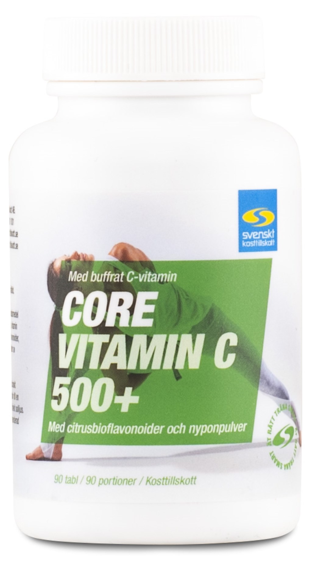 Core Vitamin C 500+ indeholder to varianter af C-vitamin; det almindelige ascorbinsyre og den pH-bufferede variant calciumascorbat, som tilbyder både mindre belastning på maven og en længere halveringstid i kroppen. Desuden er produktet forstærket med citrusbioflavonoider og hybenpulver.