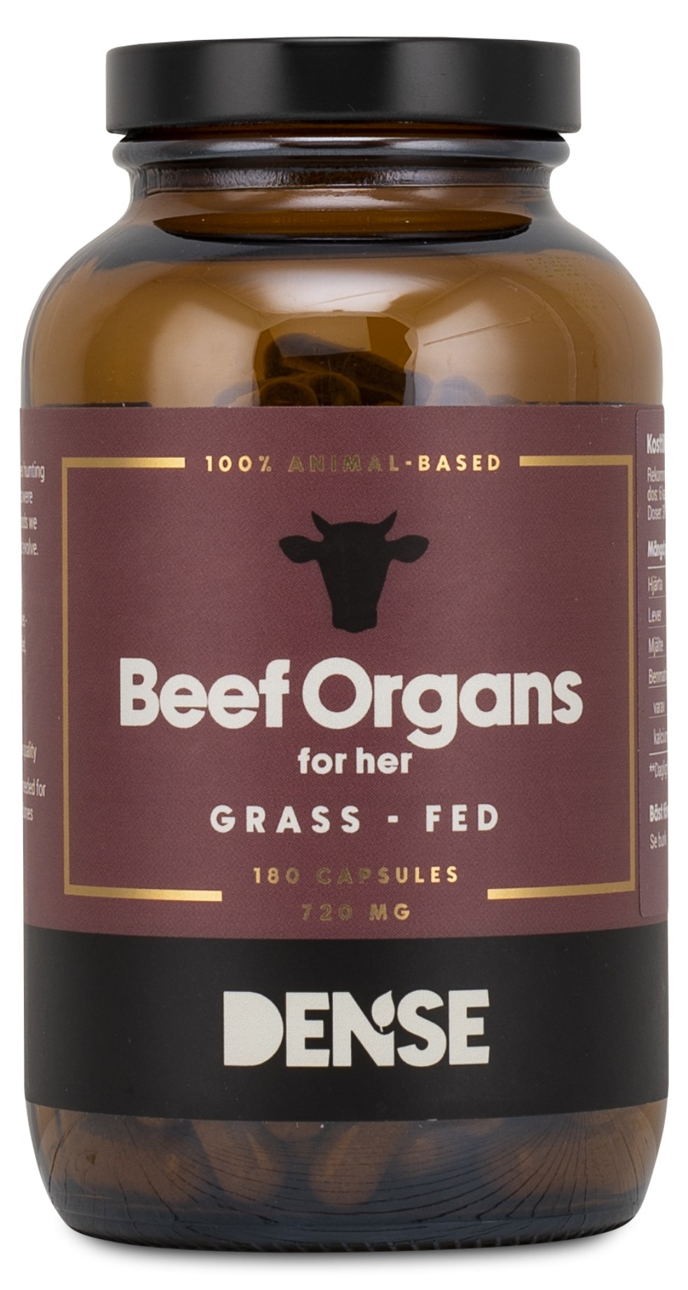Specielt udviklet til kvinders behov, indeholder Dense Okseorgan for Her frysetørrede organer fra græsopdrættet kvæg: hjerte, lever, milt og knoglematrix. Hjerte og milt har en lang tradition i forskellige madkulturer for energi og vitalitet. Lever er en naturlig kilde til vitaminer og mineraler, som kroppen let kan optage. Knoglematrix indeholder en afbalanceret sammensætning af calcium, fosfor og sporstoffer. Kapslerne er nænsomt frysetørrede for at bevare råvarernes naturlige egenskaber og er helt fri for tilsætningsstoffer.