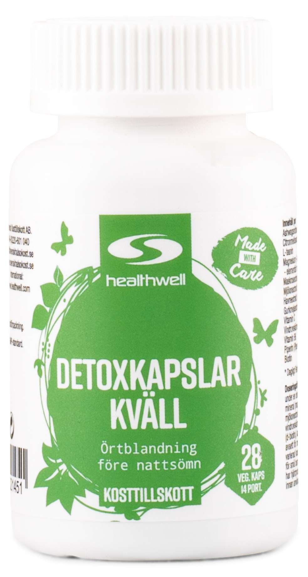 Healthwell Detox Kapsler Aften har en formel, der er specielt udviklet til at hjælpe din krop med at slappe af og slappe af inden aftenen, inklusive citronmelisse, ashwagandha og L-theanin. Dens unikke formel indeholder desuden C-vitamin, som virker antioxidant, magnesium for musklernes afspændingsevne og biotin og B6-vitamin til normal funktion af stofskiftet og nervesystemet. Detox Kapsler Aften er også beriget med piperin (sort peberekstrakt) for at bidrage til bedre optagelse i kroppen.