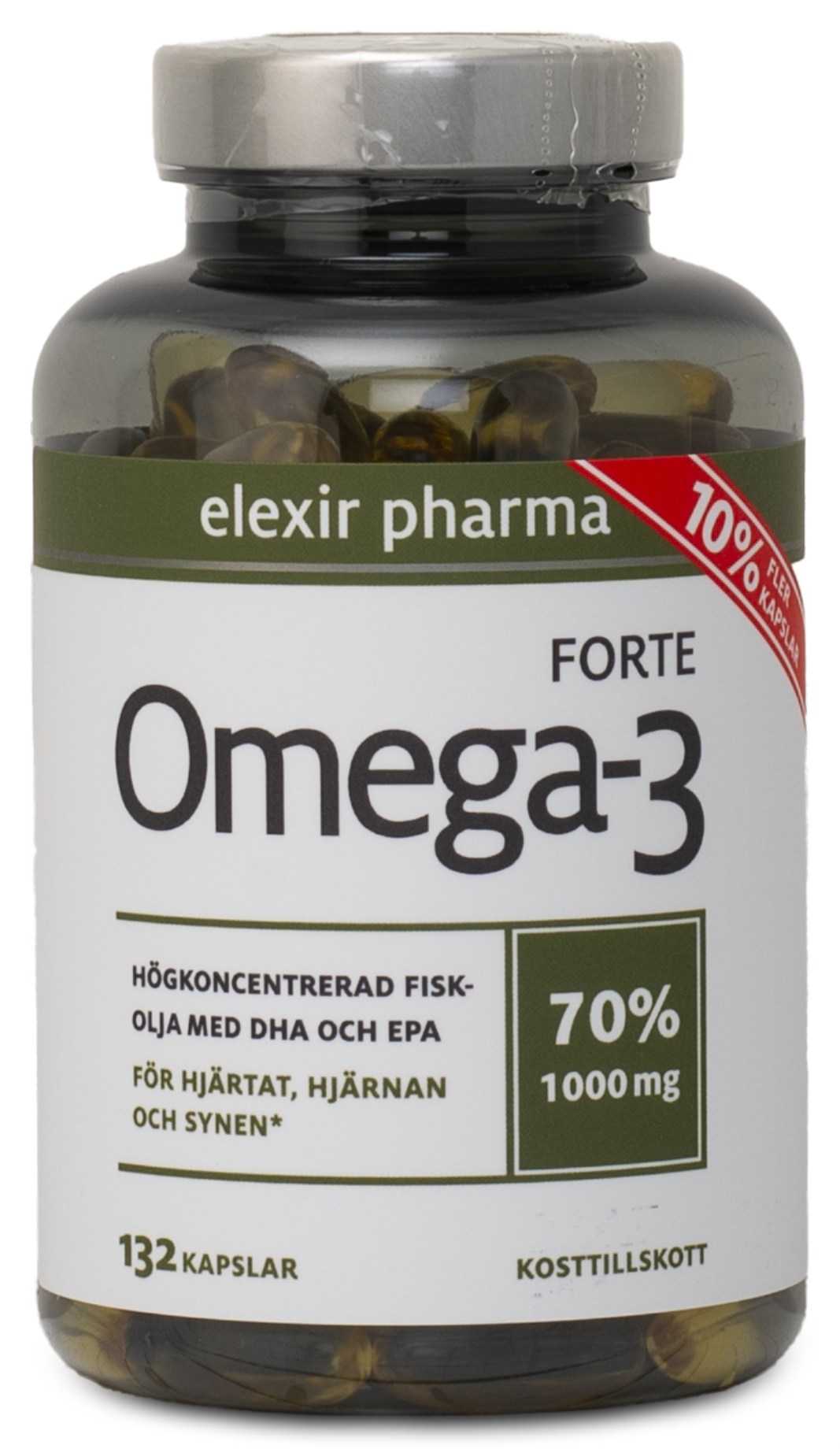 Elexir Omega-3 Forte er en højdosis fiskeolie af højeste kvalitet, hvor hver kapsel giver dig op til 70% omega-3. Det høje indhold af omega-3 fedtsyrer betyder, at du kun behøver at tage en kapsel dagligt for at overholde det anbefalede daglige indtag af omega-3. Elexir Omega-3 Forte har et højt indhold af omega-3-fedtsyrerne EPA og DHA, som bidrager til hjertets normale funktion, og DHA bidrager også til opretholdelse af normal hjernefunktion og opretholdelse af normalt syn.