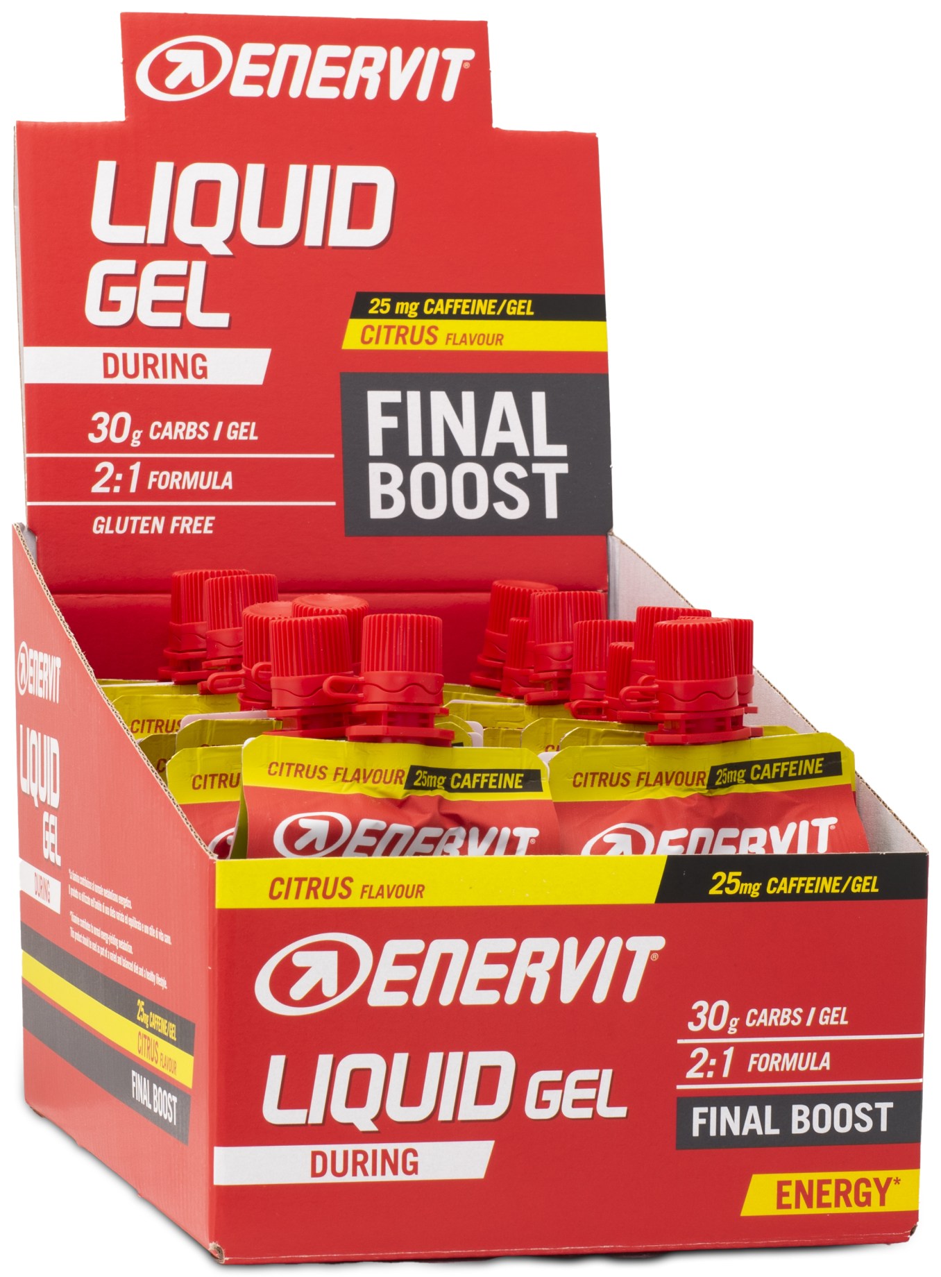 Enervit har udviklet en flydende energigel specielt tilpasset til konkurrence, hvor du vil præstere på toppen. En gel indeholder hurtige kulhydrater, som fylder dine energidepoter, samt koffein som virker mentalt opfriskende og modvirker din oplevelse af anstrengelsen. Under langvarig og intensiv aktivitet anbefaler vi op til maksimalt fire portioner, som du bør drikke med jævne mellemrum under træningen.