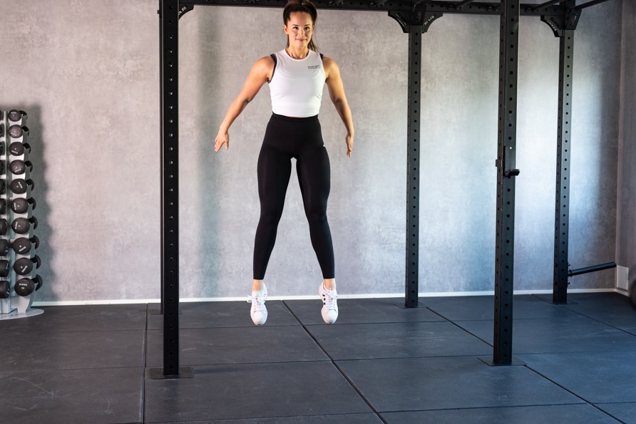 4. Når du er nede med din røv, skal du skubbe dig selv eksplosivt op og løfte dine fødder fra jorden.