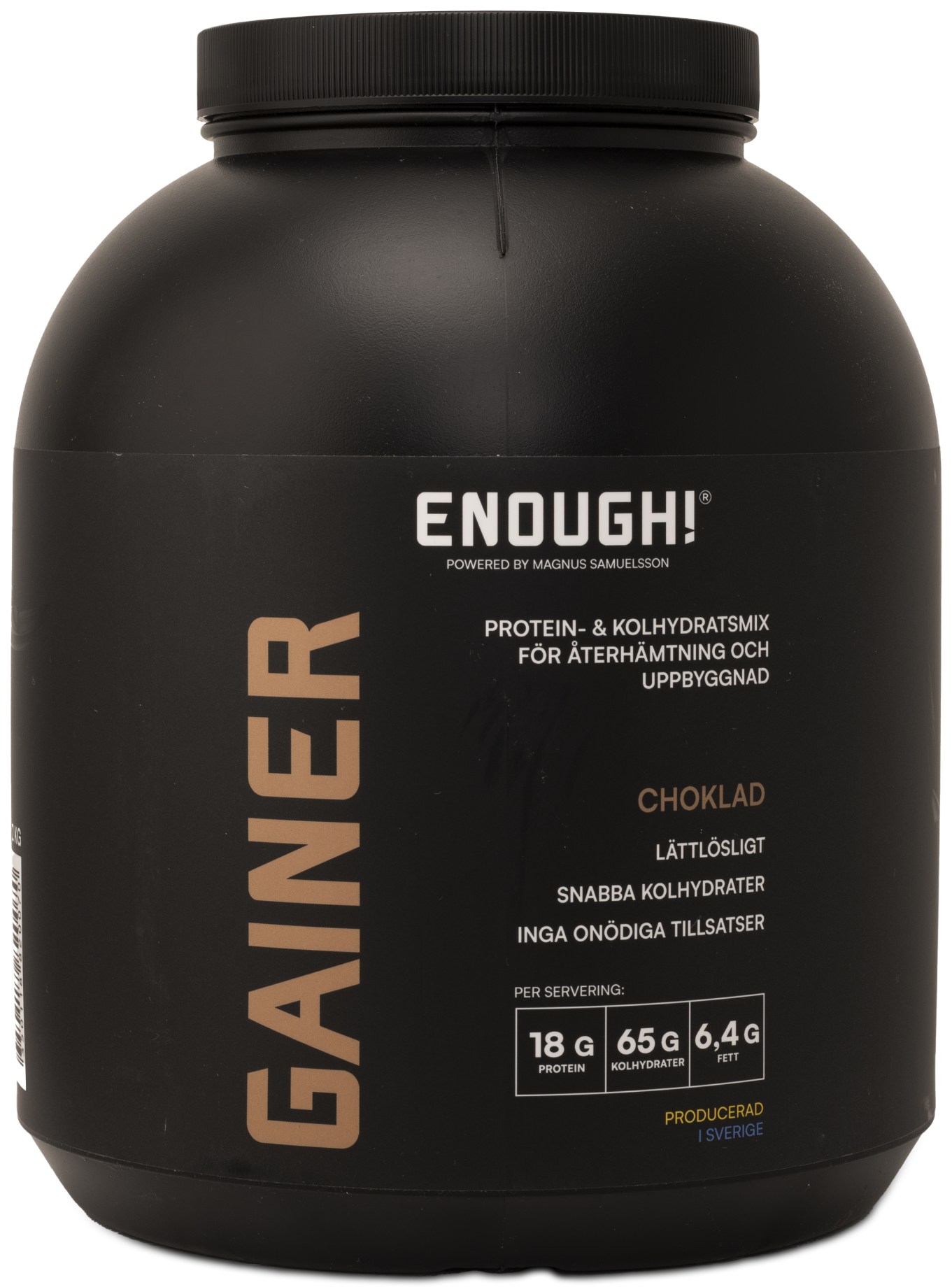 Enough Gainer er et tilskud til dig, der vil øge muskelmassen, forbedre restitutionen og tage på i vægt på en bæredygtig måde. Denne gainer indeholder en kombination af hurtige kulhydrater og svensk, højkvalitets valleprotein, som giver kroppen hurtig energi og næring – perfekt efter træning eller som mellemmåltid, når du har brug for energi og ekstra brændstof. Enough Gainer er udviklet i samarbejde med ernæringseksperter, læger og svenske landmænd med fokus på funktion, bæredygtighed og resultater uden kompromisser. Denne gainer passer til dig, der træner hårdt og har brug for en hurtig, enkel måde at få energi og kalorier for at støtte restitution og opbygning, samt til dig, der har svært ved at få nok kalorier i løbet af dagen.