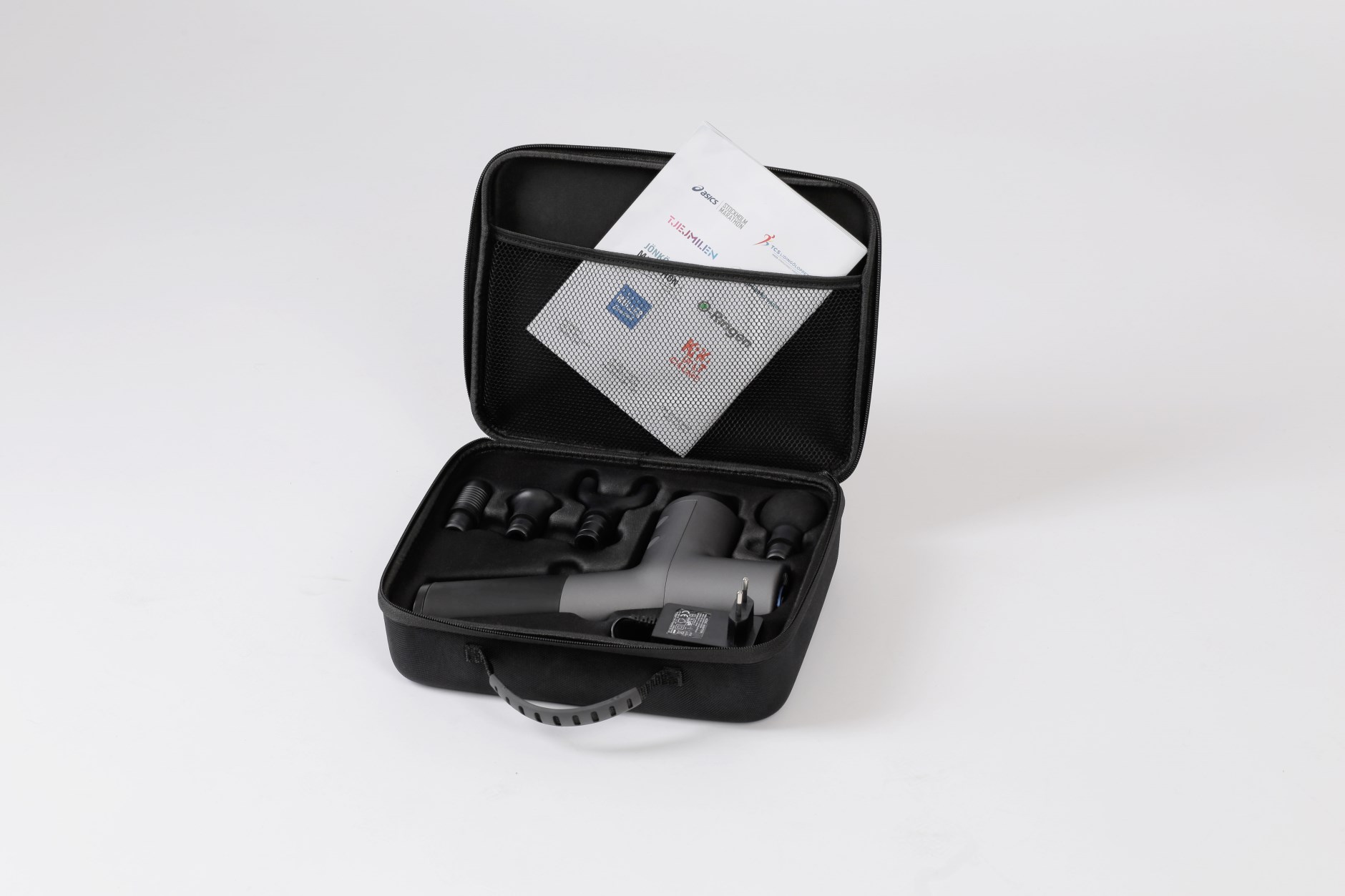 En massagepistol er et massageapparat, der har en bevægelig arm, hvor du kan fastgøre en af de medfølgende mundstykker. Når dysen bevæger sig frem og tilbage i høj hastighed, produceres vibrationsbølger, der trænger dybt ind i bindevævet i kroppen. På den måde blødgøres musklerne, hvilket reducerer smerten, og musklerne kommer sig hurtigere efter f.eks. træning. Massagepistolen hjælper også med at reducere opbygningen af mælkesyre, under hårde træningspas. Når du reducerer mælkesyren, accelereres muskelhelingen og dermed restitutionen efter din træning. Men takket være massagepistolens øgede blodgennemstrømning, hjælper det også musklerne med at slappe af, hvilket passer til dig, der har et stillesiddende job og har brug for hjælp til at slippe af med muskelknuder.