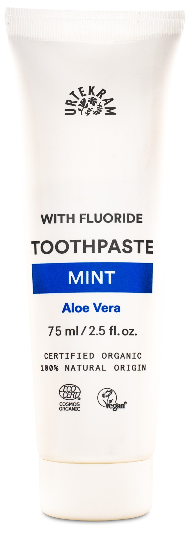 Urtekram Tandpasta med Flour er en god fluortandpasta baseret på naturlige og vegetabilske ingredienser med økologiske ingredienser, hvor det er muligt. Dette inkluderer pleje fra aloe vera og mentol. Fluor hjælper med at forhindre karies (huller i tænderne) og er blevet brugt i tandpasta i over 70 år. Aloe vera har en gavnlig virkning på tandkødet, og menthol giver en frisk smag til munden og en frisk ånde. Urtekrams fluortandpasta kan bruges som din daglige tandpasta.