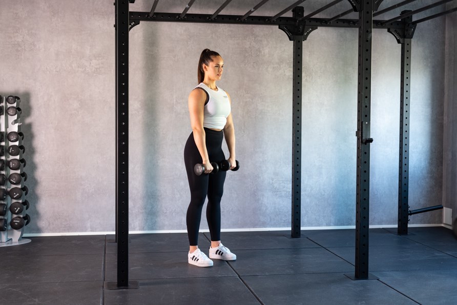 2. I startpositionen holder du håndvægtene nedsænket med hænderne parallelt på hver side af dig.