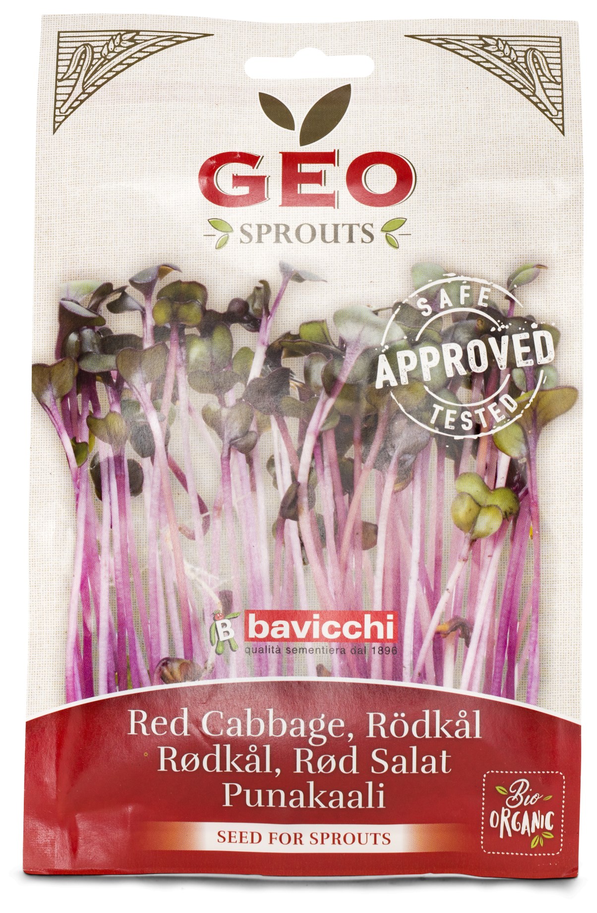GEO Rødkålsfrø ØKO er økologiske frø, af den milde og søde rødkål. Disse frø er lette at spire derhjemme og ud over en god smag, er de også naturligt rige på vitaminer og økologisk sulfur. GEO Rødkålsfrø ØKO får en smuk lyserød farve, når de spirer, og du kan nyde spirerne ligesom de er eller blande dem i en god salat. Frøene kan høstes efter 4 dage, og kan opbevares i køleskabet i et par dage.