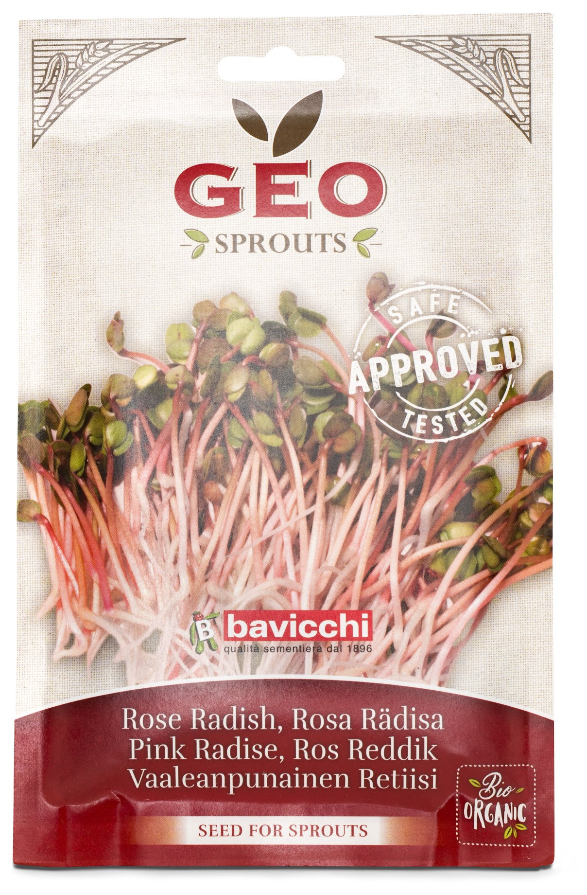 GEO Rosa Radisefrø ØKO bruges, når du gerne vil spire derhjemme. Disse økologiske frø fra den rosa radise (China Rose) har en spiretid på 4 dage, og er derefter klar til at høstes til at blande i en god salat, madlavning eller på sandwich. Smagen er mindre intens i en rosa radise end i en radise, men har stadig en krydret smag med meget skarphed. GEO Rosa Radisefrø ØKO indeholder masser af vitaminer og mineraler såsom A-vitamin, riboflavin, jern, kalium og magnesium. Derudover er det sjovt at spire selv - det går hurtigt, og du får velsmagende og nyttige spirer inden for et par dage!
