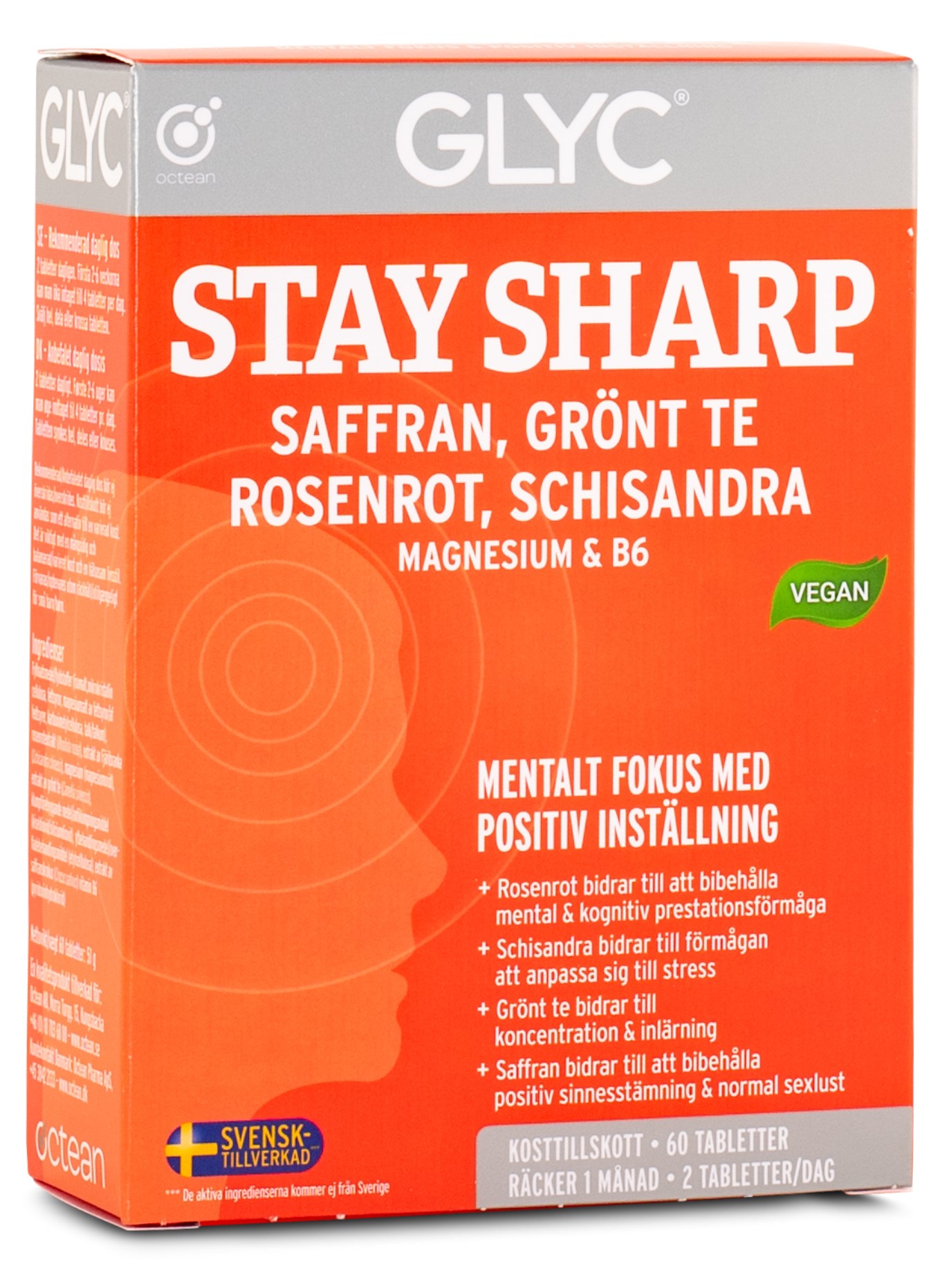 Glyc Sharp indeholder en ultimativ sammensætning af aktive stoffer til perioder med høj belastning i hverdagen. Gennem hele livet findes der anledninger, som stiller ekstra høje krav til os, og med årene bliver der bare flere og flere ting at holde styr på. Glyc Sharp er særligt udviklet til at imødekomme disse krav med et indhold baseret på forskning. Glyc Sharp er produceret i Sverige og er helt vegetabilsk.
