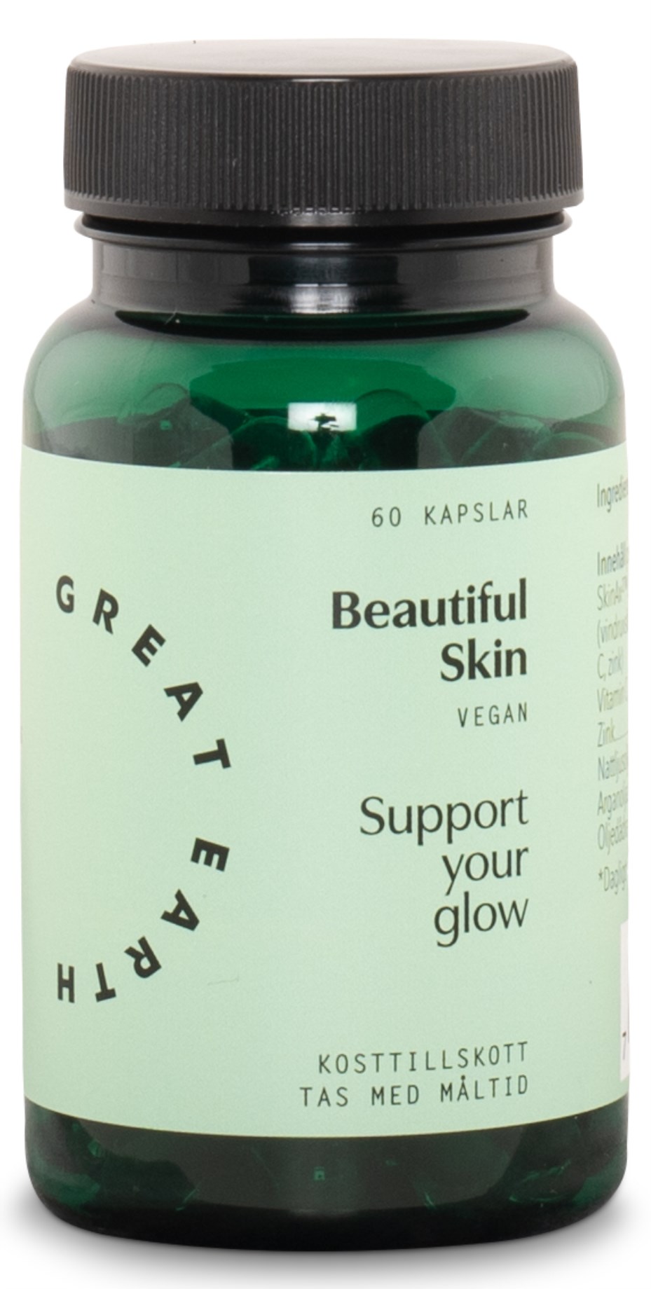 Great Earth Beautiful Skin er et tilskud, der hjælper med at opretholde en normal hud. Tilskuddet er unikt med sin DuoCap, en kapsel i kapslen, hvor den ydre kapsel består af de tre olier arganolie, kæmpenatlysolie og gold of pleasure oil (sæd-dodder). Disse olier skaber en balance mellem essentielle fedtsyrer, der giver næring til huden. Den indre kapsel består af det patenterede SkinAx2-ekstrakt, der består af champagnedrue og fransk melon, samt C-vitamin og zink, der beskytter cellerne.