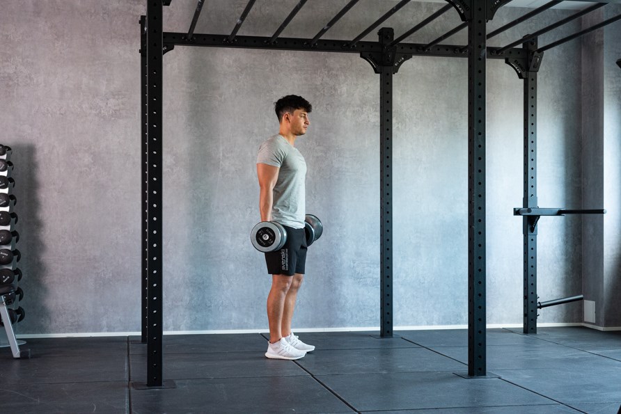 1. Tag fat i håndvægtene med hænderne skulderbredde fra hinanden og stå fast med dine fødder.