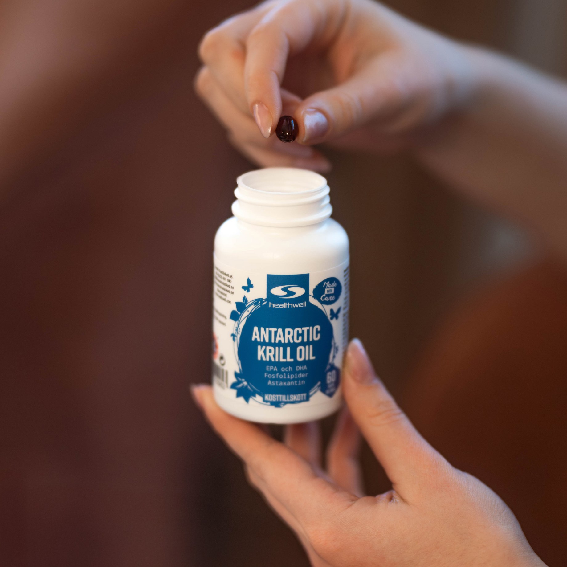 Healthwell's Antarctic Krill Oil tilbyder en fremragende kilde til flere sunde fedtsyrer, der er essentielle for mange kropsfunktioner. Denne olie udvindes fra bæredygtigt fanget krill, også kendt som lyskrebs, som lever i de kolde have omkring Antarktis. Den indeholder en afbalanceret blanding af omega-3-fedtsyrer såsom DHA og EPA samt omega-6, omega-9 og fosfolipider. Derudover er den beriget med astaxanthin, en naturlig forbindelse, der findes i krill, og som spiller en vigtig rolle for kroppens sundhed. Healthwell's Krillolie er et dagligt kosttilskud, der fremmer normal hjerte-kar-sundhed, immunforsvarets funktion samt normal cellulær aktivitet.