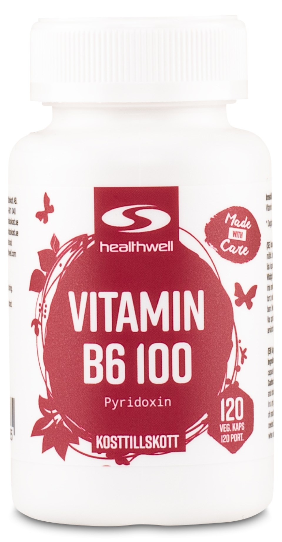 B6-vitamin 100 mg er et højdoseret B6-vitamintilskud i vegetabilske kapsler. B6-vitamin, også kaldet pyridoxin, er et vigtigt vitamin for kroppens normale energiomsætning, og det er nødvendigt for proteinomsætningen. Vitaminet menes også at kunne modvirke træthed og udmattelse, og det hjælper desuden nervesystemet med at fungere normalt. B6-vitamin er et vandopløseligt vitamin, som ikke opbevares i kroppen, og det er derfor nødvendigt at indtage det med en alsidig kost eller i form at et tilskud. Healthwell B6-vitamin 100 indeholder 100 mg B6-vitamin pr. kapsel, og det indtages i forbindelse med et måltid.