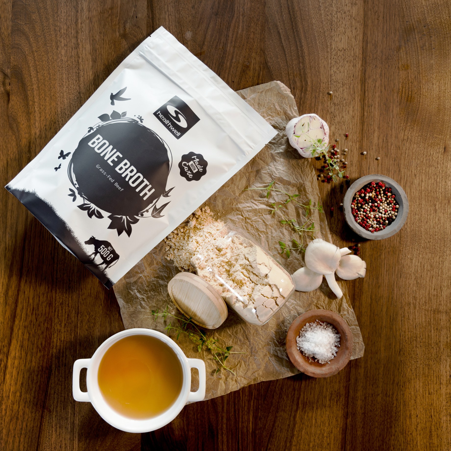 Ønsker du at give kroppen naturlig næring? Healthwell Bone Broth Grass Fed er et rent pulver af bone broth helt uden tilsætningsstoffer, fremstillet af græsfodret kvæg for at sikre en råvare af høj kvalitet. I dagens moderne kost går vi ofte glip af næringen i dyrets øvrige dele end selve kødet. Her får du en enkel måde at dække kroppens behov for letoptagelig næring, kollagen, protein og mineraler. Healthwell Bone Broth Grass Fed er naturlig og fri for smagsstoffer. Det giver en mild, naturlig smag og diskret duft, der gør det nemt at smagssætte efter egne præferencer.