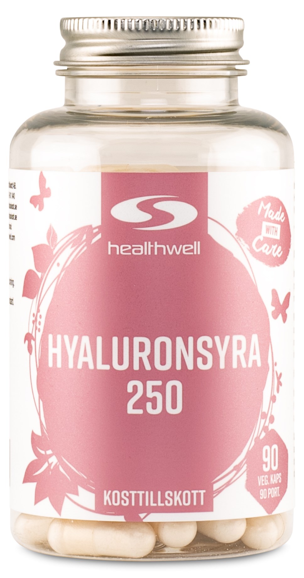 Healthwell Hyaluronsyre 250 er kapsler med hyaluronsyre med 250 mg per kapsel. Desuden indgår citrusbioflavonoider med vitamin C i en optimal kombination. Hyaluronsyre er et naturligt stof, som findes i kroppens led og i huden. C-vitamin fungerer som en antioxidant samt bidrager til, at kollagen dannes normalt. Hyaluronsyre 250 er et fleksibelt tilskud til dig, som ønsker at få ekstra hyaluronsyre via kosten og udnytte dets unikke egenskaber, fx hvis du træner hårdt med tung belastning på kroppen.