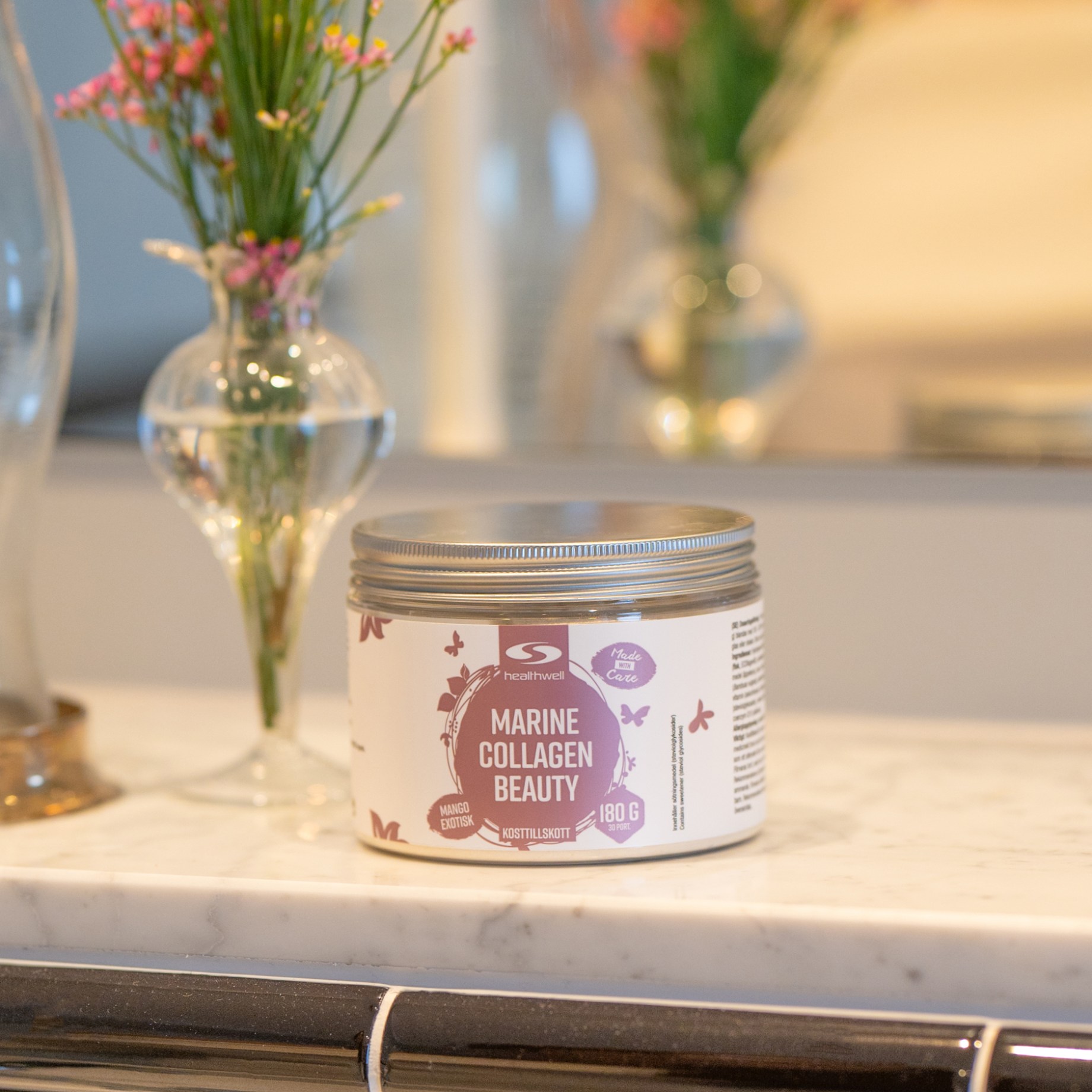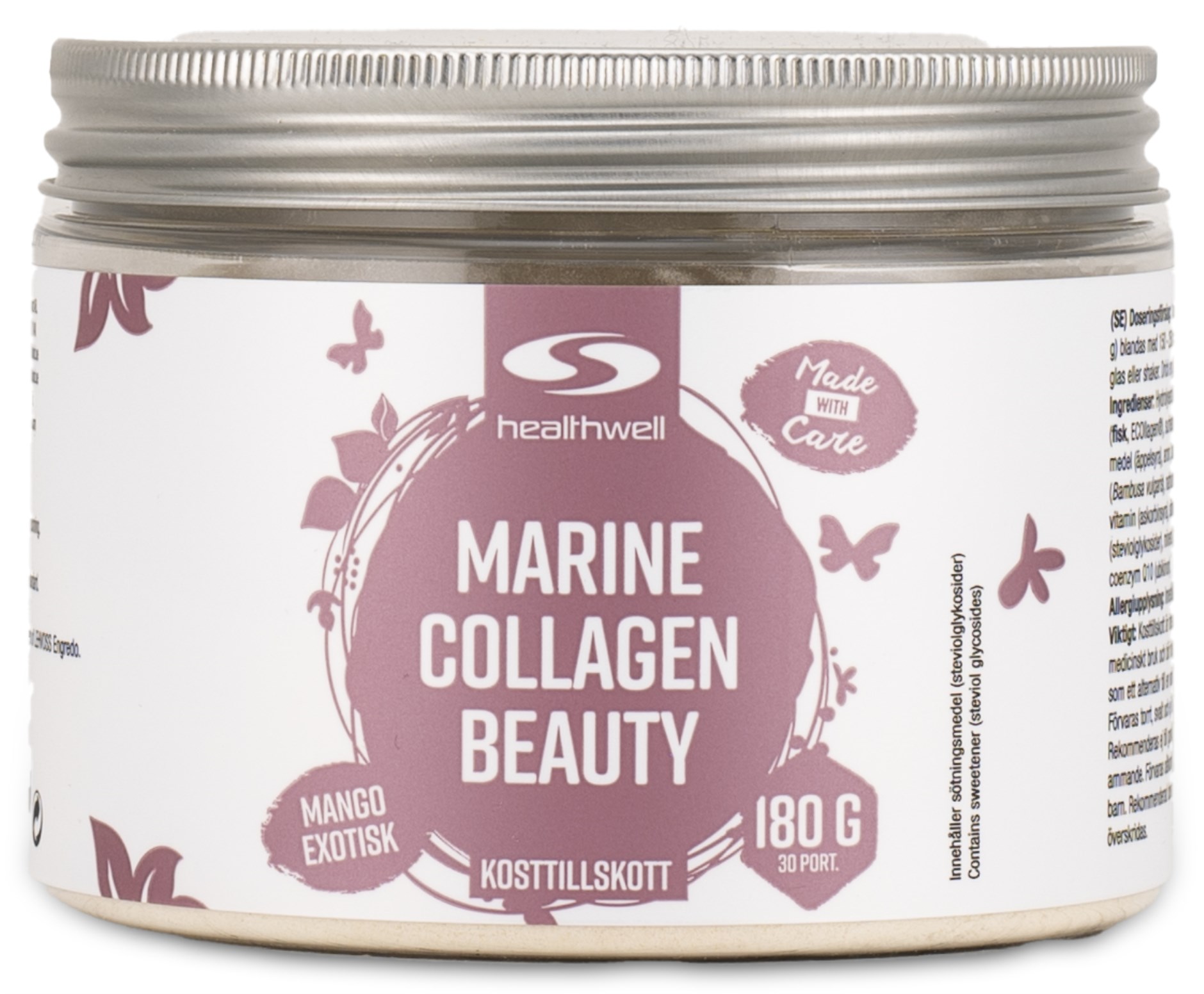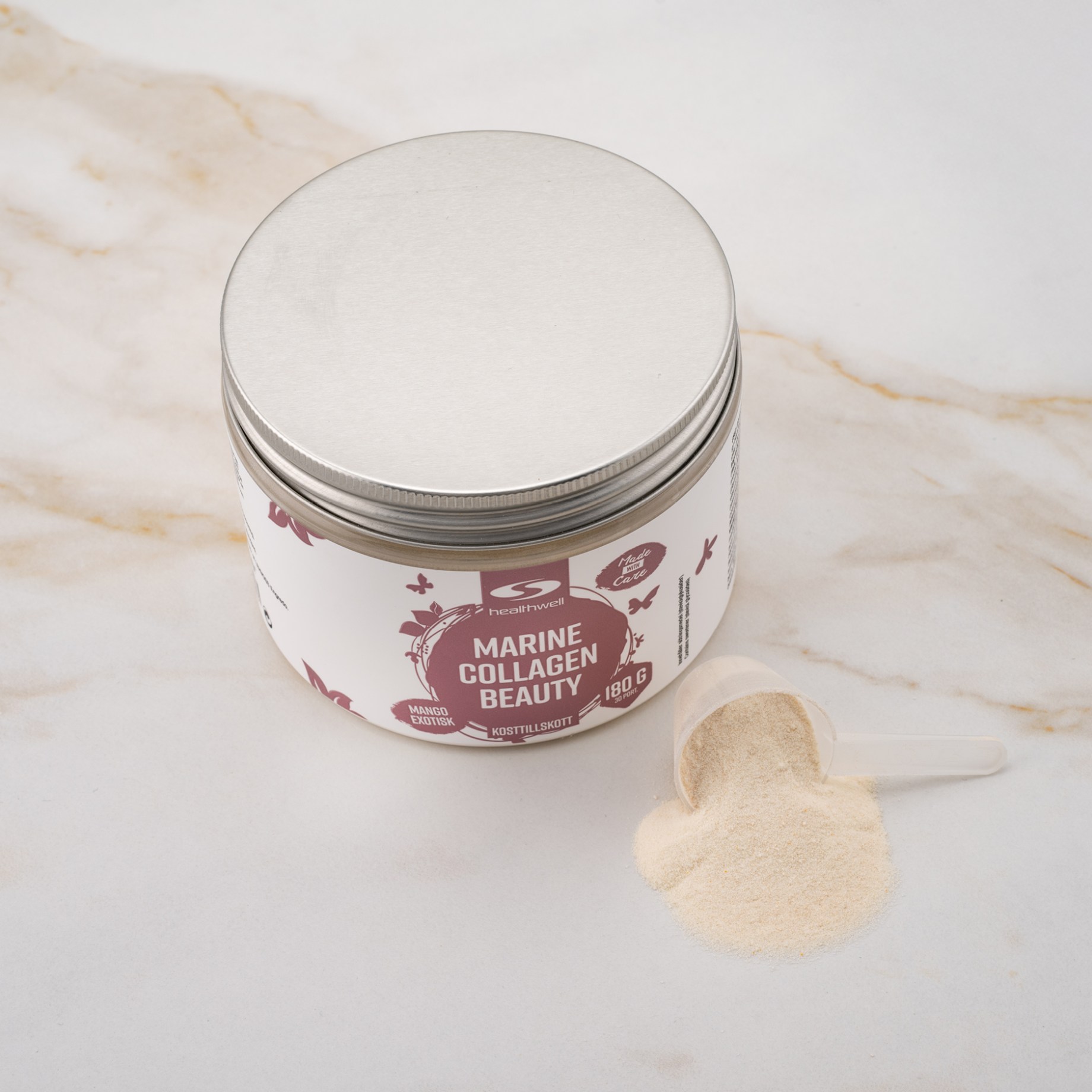 Healthwell Marine Collagen Beauty er et kollagentilskud med udvalgte ingredienser, perfekt til dig, der ønsker at støtte hårets, hudens og neglenes naturlige skønhed indefra og ud. Tilskuddet har en fantastisk smag af eksotiske frugter og har ingen fiskesmag. Det er desuden let at blande i væske - bland nemt med en ske eller i en shaker for det bedste resultat.
