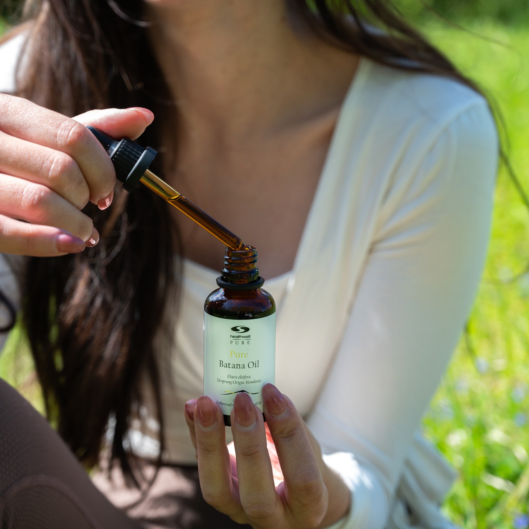 Batanaolie presses fra kernerne af den amerikanske palme (Elaeis oleifera) og er naturligt rig på blødgørende fedtsyrer samt tocopheroler og tocotrienoler, der fungerer som antioxidanter. Den har traditionelt været brugt i Centralamerika til at styrke håret og pleje huden. Konsistensen varierer afhængigt af produktionen – fra smøragtig til flydende. Healthwells variant er i en praktisk flydende form, der gør den nem at bruge i hverdagen.