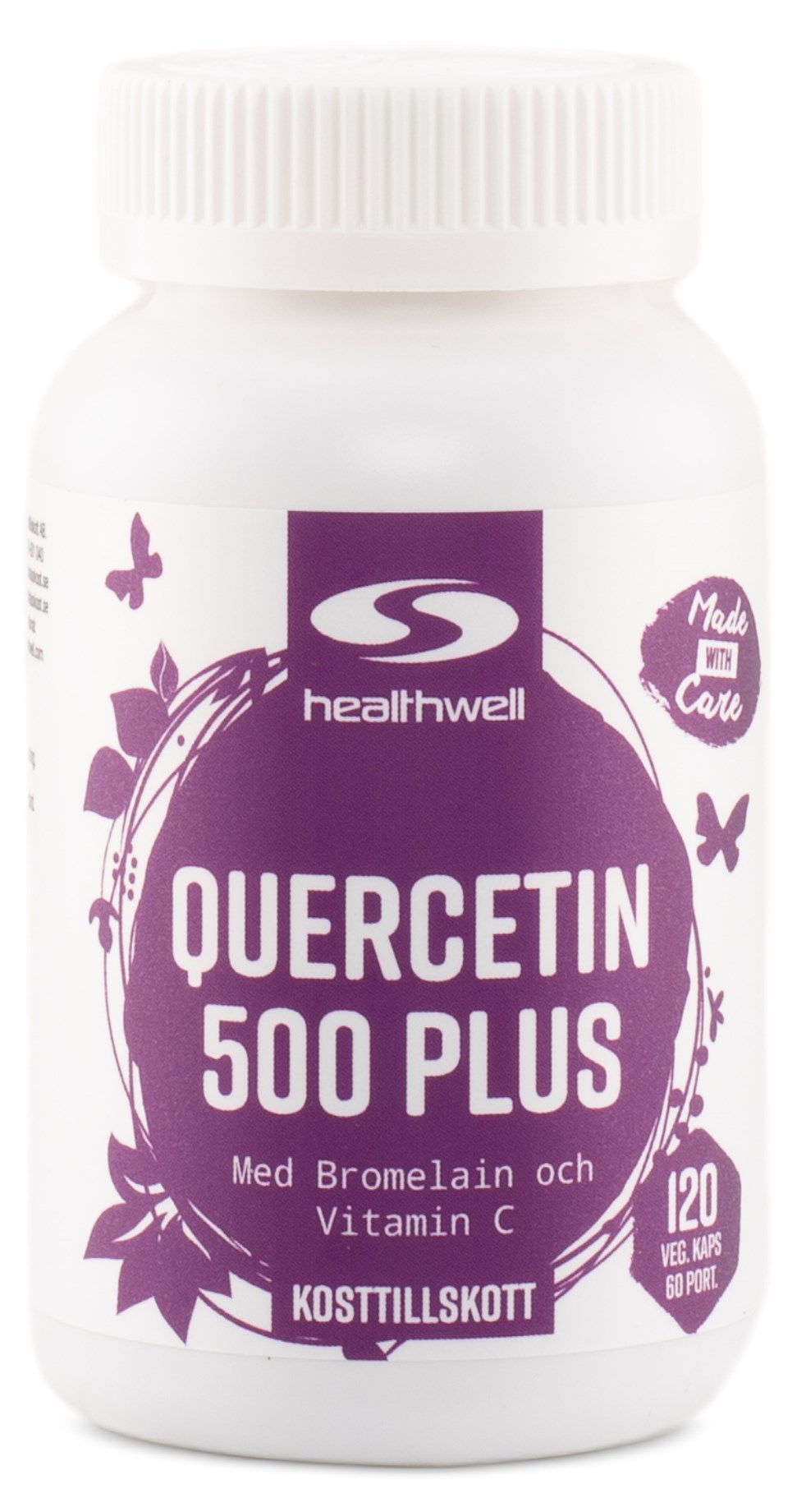 Healthwell Quercetin 500 Plus indeholder naturlige flavonoider (Sophora japonica) i vegetabilske kapsler, med 500 mg quercetin per dosis (250 mg per kapsel). Derudover er bromelain og C-vitamin tilsat, for den bedste effekt. Bromelain hjælper med at fremme enzymaktivitet og dermed absorberingen af quercetin i kroppen. C-vitamin bidrager til absorberingen af bromelain. C-vitamin fungerer også som en antioxidant, som modvirker oxidativ stress samt bidrager til et normalt immunsystem.