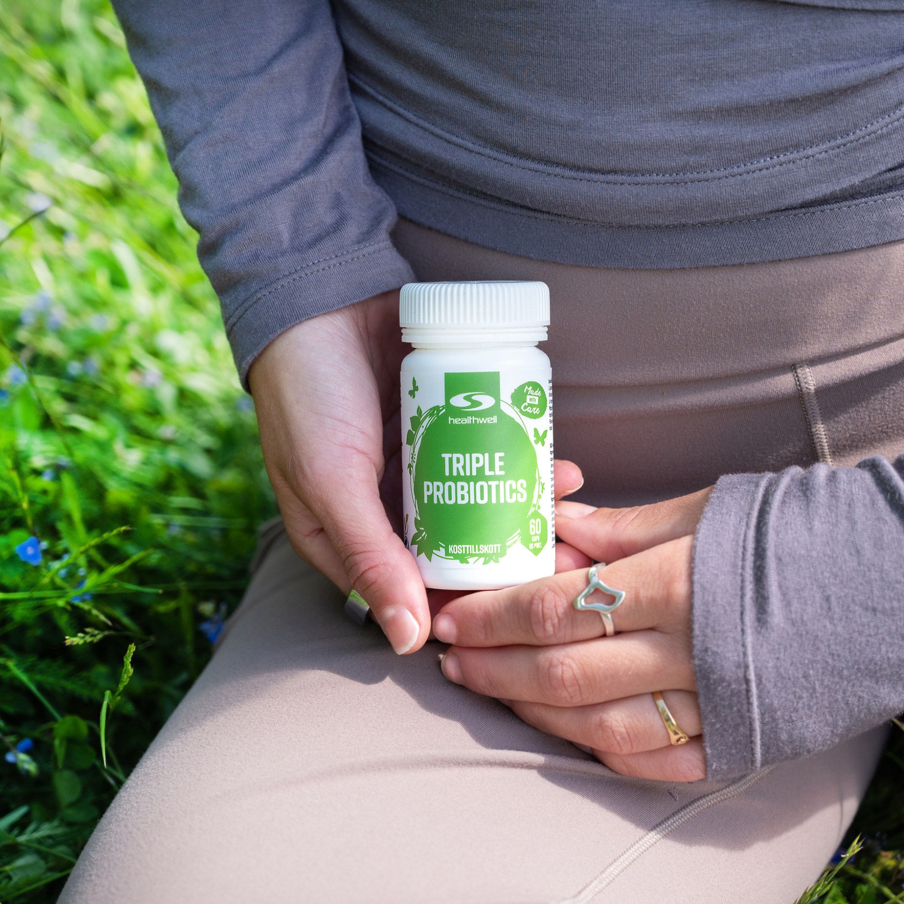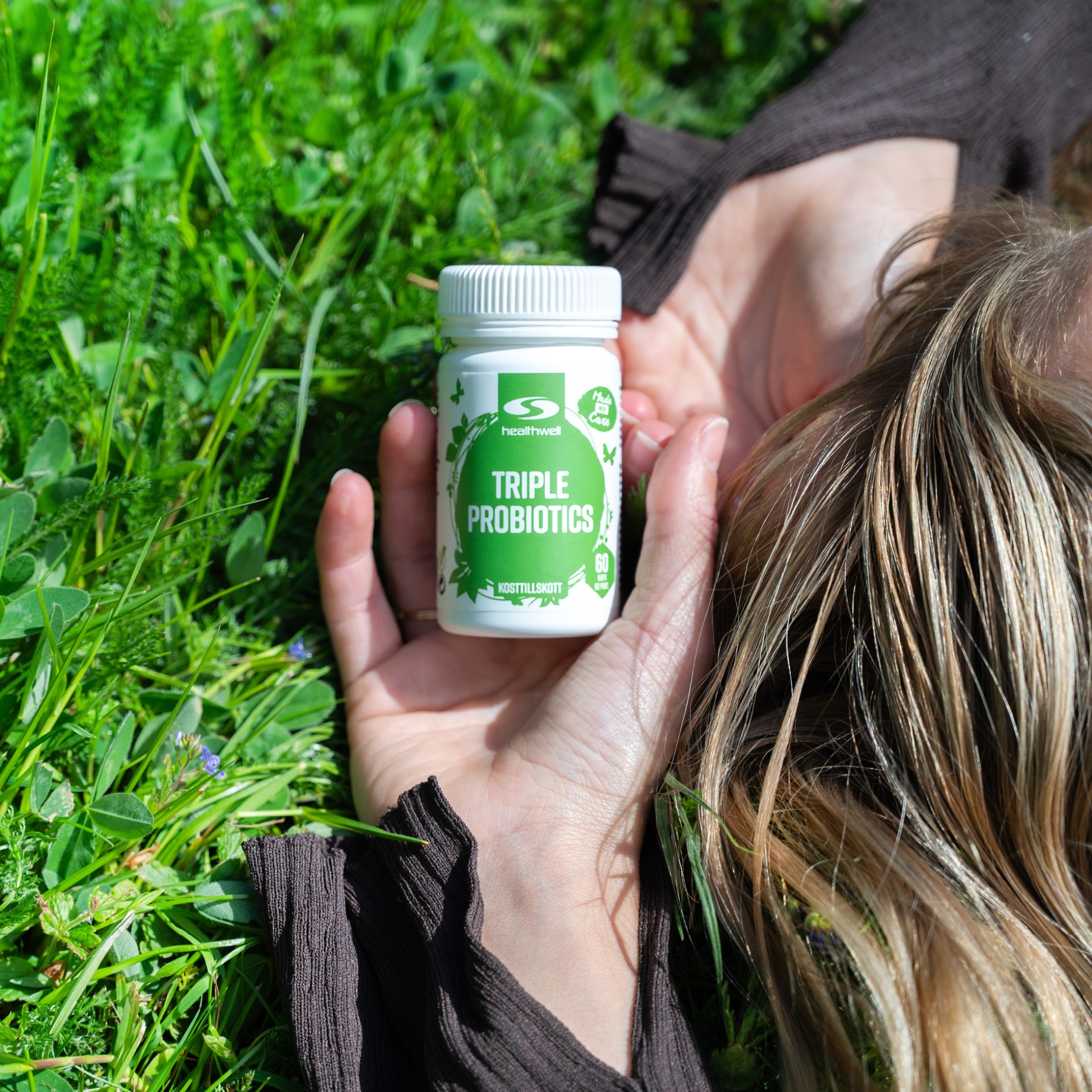 Hvis du oplever oppustethed, stressmave eller urolig mave, kan Healthwell Triple Probiotics være interessant for dig. Produktet tilbyder en kombination af 7 milliarder bakterier fra tre velstuderede stammer, forstærket med urterne pebermynte, ingefær og fennikel. Derudover indeholder det inulinfibre, der fungerer som præbiotika - næring til mælkesyrebakterierne - hvilket gør det til et komplet kosttilskud!