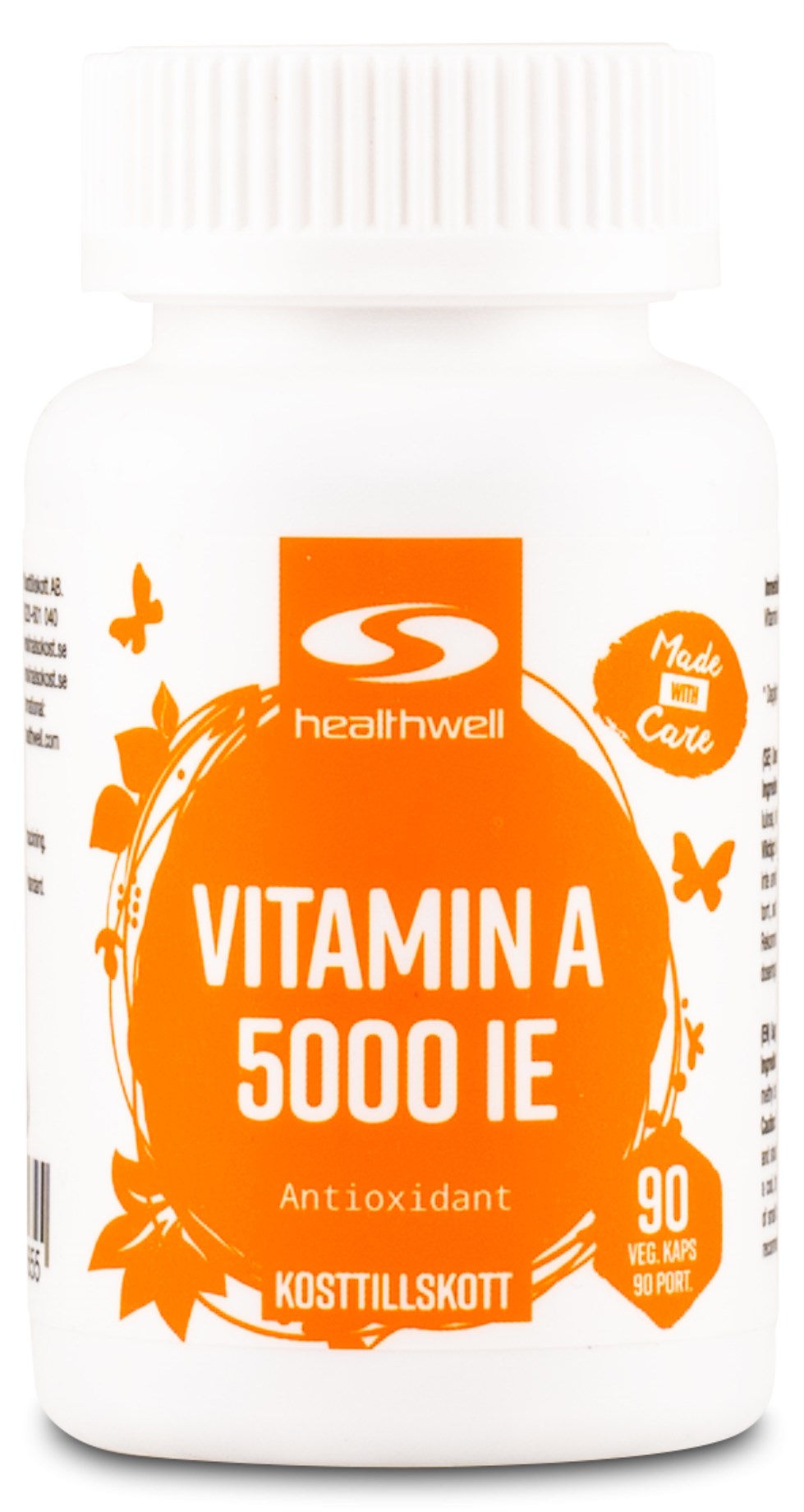 Healthwell Vitamin A 5000 IE indeholder retinylpalmitat, også kaldet præformet vitamin A. Det er vitamin A i aktiv form, som kroppen kan bruge direkte. Retinylpalmitat er desuden skånsomt for mave og tarme og er velegnet til personer med sart mave.