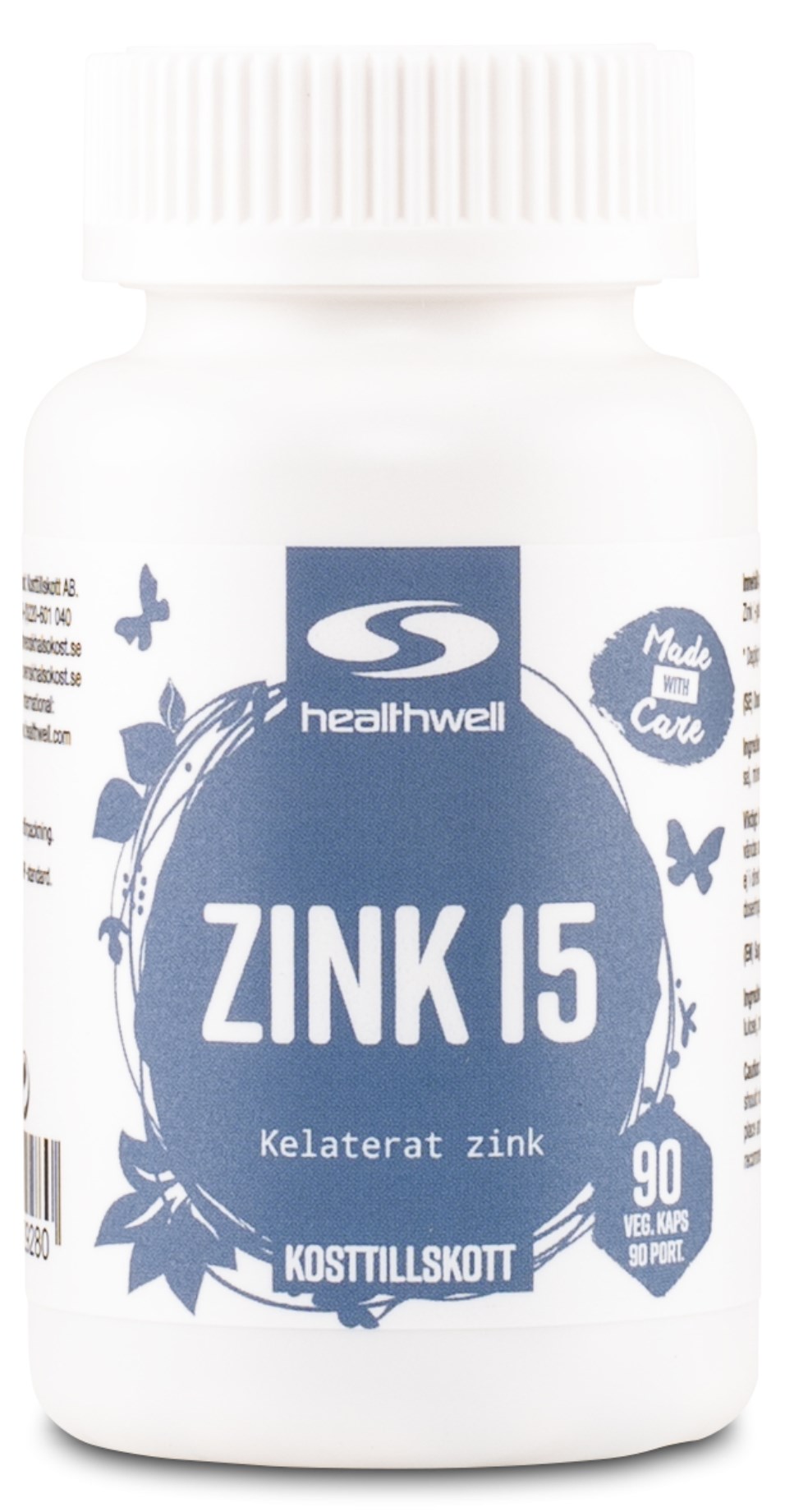 Healthwell Zink 15 er et kosttilskud med mineralet zink i vegetabilske kapsler. Tilskuddet indeholder tre former for zink i ekstra letoptagelige former. Zink er et vigtigt mineral, der deltager i flere vigtige processer i vores krop. Det fungerer bl.a. som en antioxidant, der beskytter vores celler mod oxidativt stress og bidrager også til kvaliteten af vores hud, hår og negle. Zink er også vigtigt for os for at opretholde et normalt fungerende immunsystem. Healthwell Zink 15 indeholder 15 mg zink per kapsel, som er velegnet til dig, der ønsker at kunne kombinere med andre kosttilskud.
