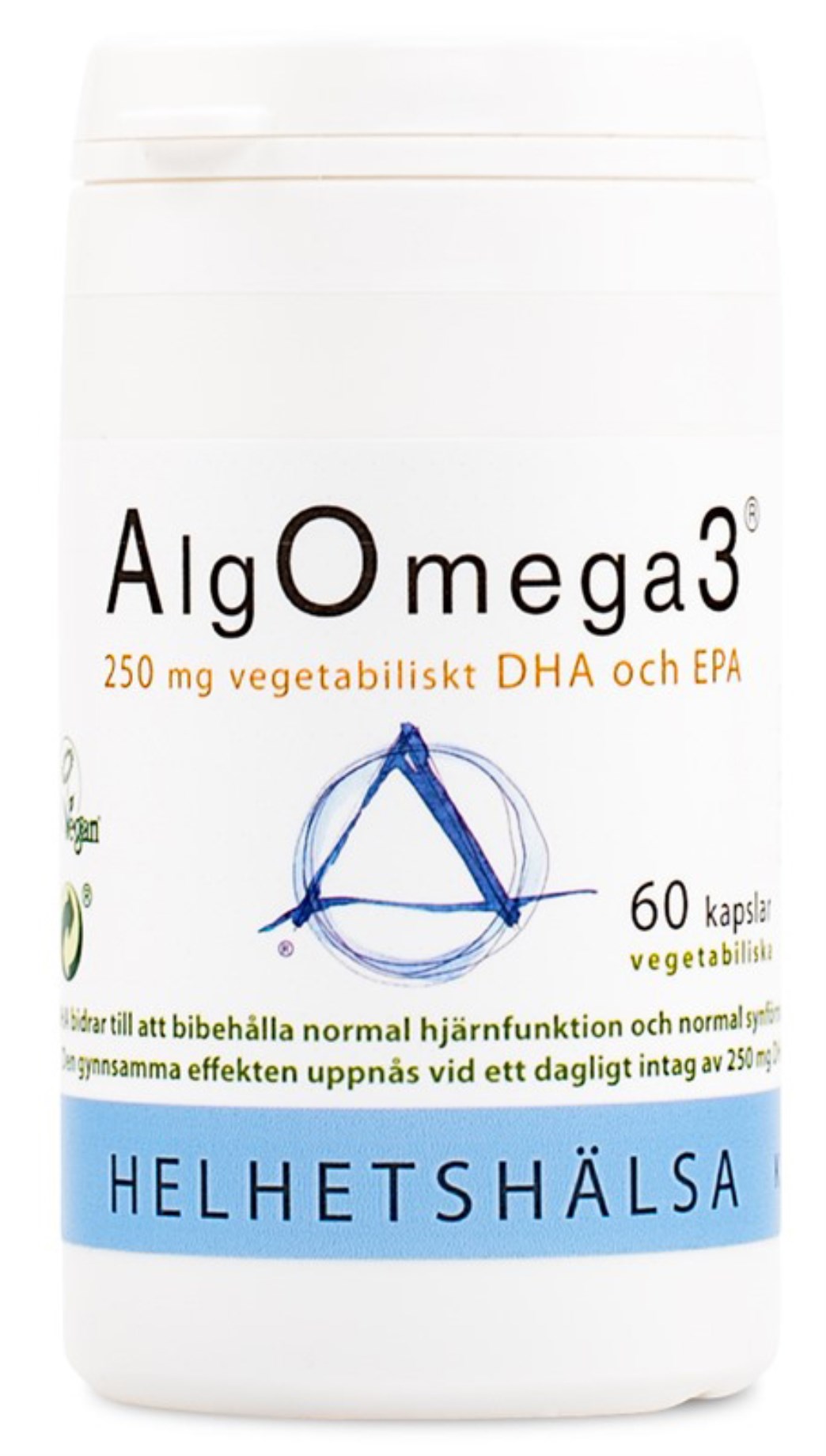 Helhetshälsas AlgOmega er et tilskud med omega 3, udvundet fra alger. Interessant for dig, der er vegansk (godkendt af Vegan Society). Nu med opdateret formel og endnu mere EPA!