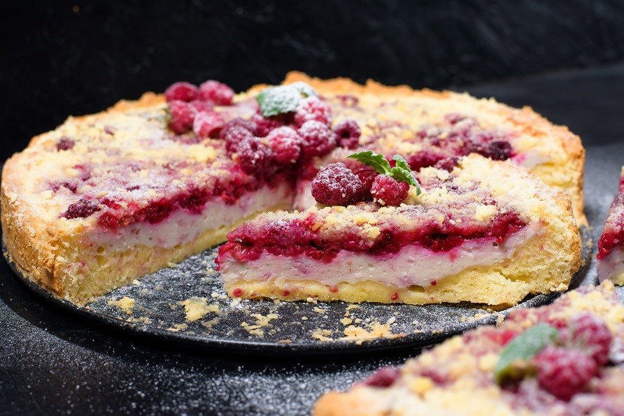 En sommerlig tærte til alle hindbærelskere. Proteincremen gør desuden, at tærten mætter ekstra længe.