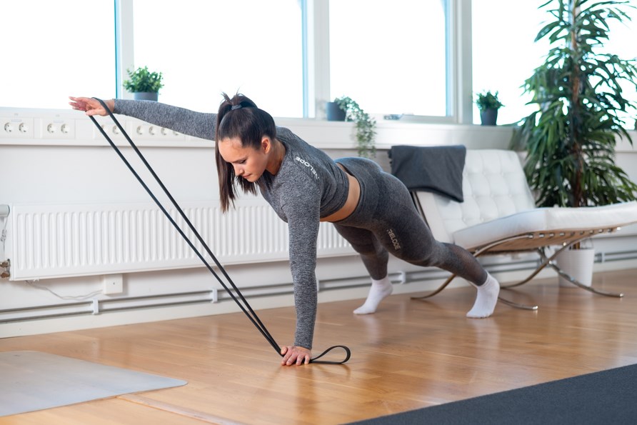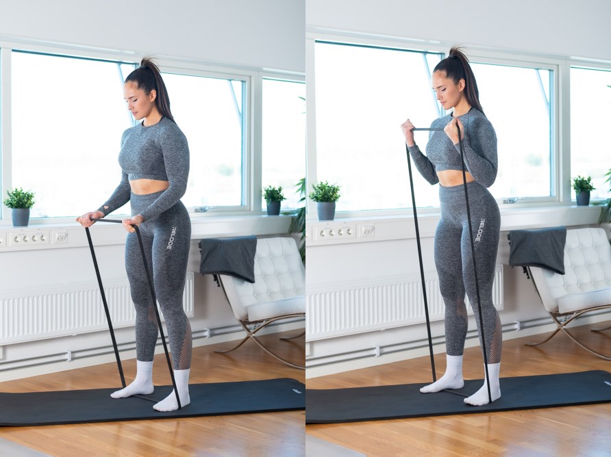 Afhængigt af hvilken modstand du har på elastikken, og hvor meget du fylder din pose, kan du køre alt mellem 10-15 gentagelser x 4 sæt. Hvis du synes, det er for let, skal du tage en elastik med mere modstand, lægge mere vægt i posen eller køre et andet sæt.
