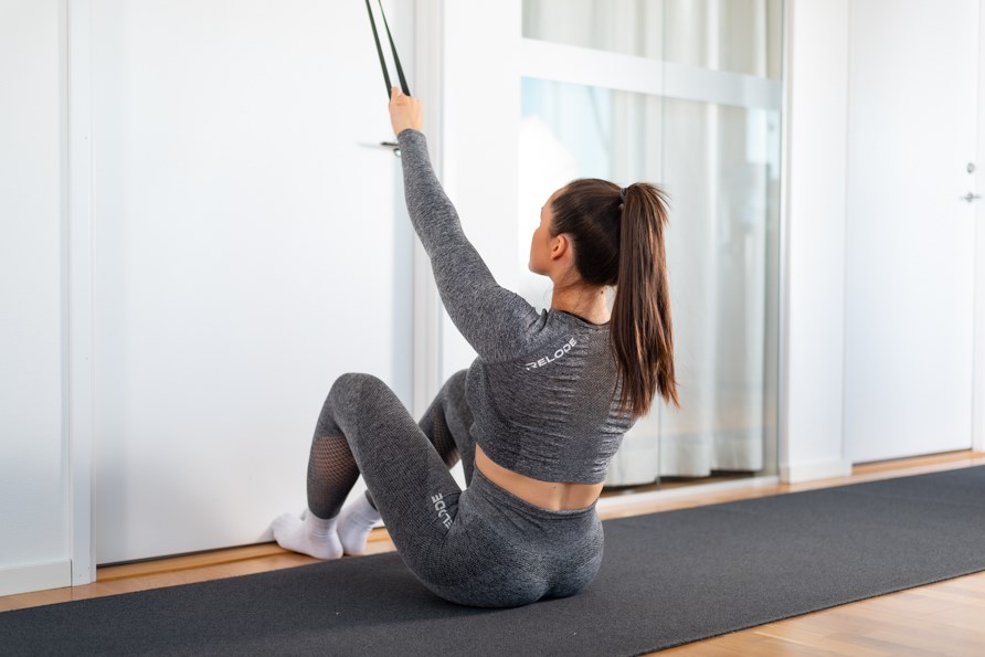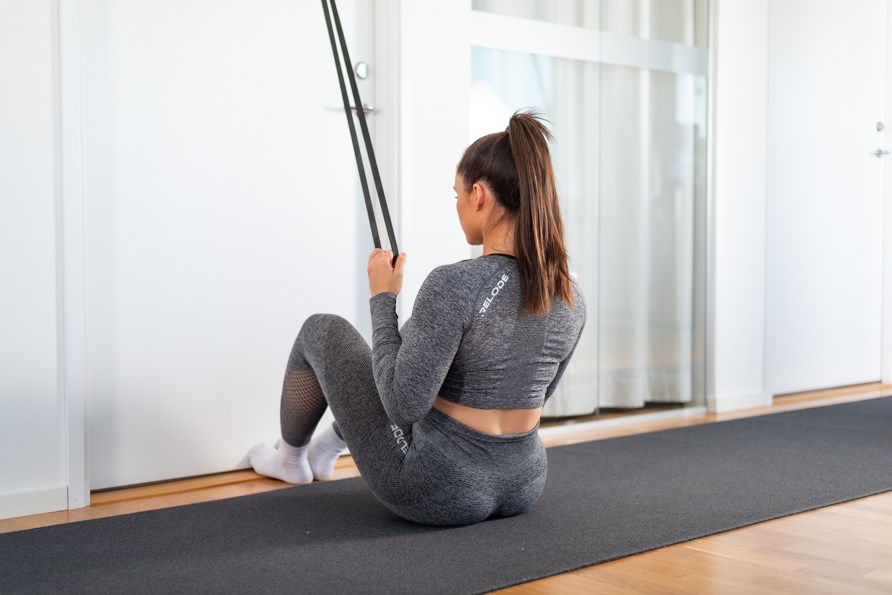- Tag fat i den anden ende af elastikken, og sæt dig på gulvet