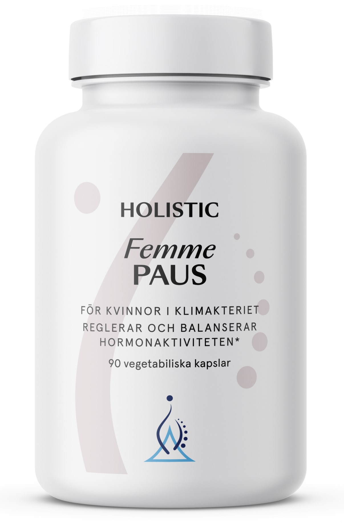Holistic Femme Paus er et specielt tilskud af næringsstoffer til kvinder, der går igennem overgangsalderen. Det indeholder blandt andet B6-vitamin, magnesium og zink. B6-vitamin hjælper med at regulere hormoner, magnesium hjælper med at mindske træthed og zink hjælper med at styrke knogler, hår, hud og negle samt bidrager til hormonbalancen. Sammen med ekstrakt fra rødkløver og humle kan dette tilskud støtte kvindens krop til at håndtere overgangsalderen på en rolig måde.