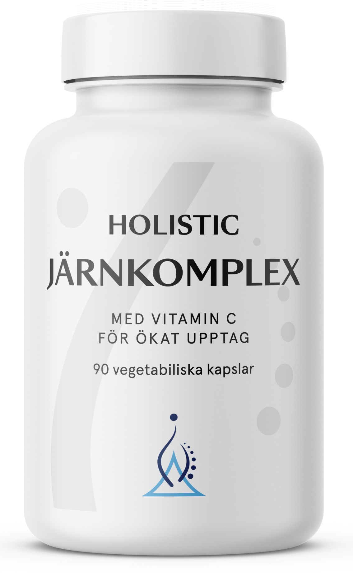 Holistisk Jernkomplex er et supplement med jernformerne, jernbisglycinat og jerngluconat. Jern bidrager blandt andet til normal bloddannelse, til immunforsvarets normale funktion og til at reducere træthed og udmattelse. Holistisk Jernkomplex indeholder også C-vitamin, som øger optagelsen af jern i kroppen.