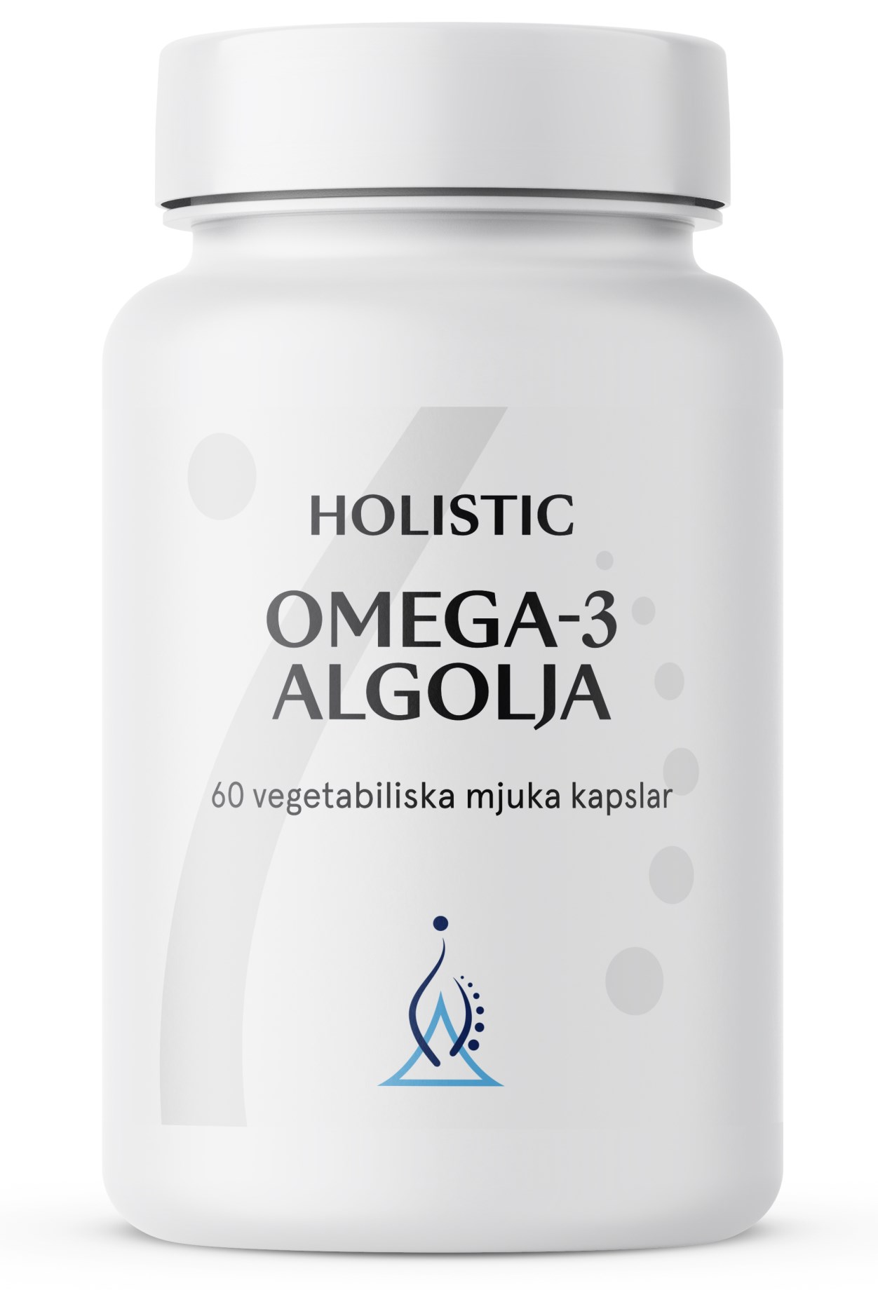 Holistic Omega-3 Algolja er et kosttilskud med en vegetarisk kilde til omega-3. Algeolie er rig på fedtsyrerne EPA og DHA, og er udvundet fra mikroalgen Schizochytrium sp. Kapslerne er vegetabilske og giver dig det daglige indtag af DHA, hvilket hjælper med at bevare en normal hjernefunktion og normalt syn. Det kombinerede indtag af EPA og DHA, bidrager desuden til hjertets normale funktion.