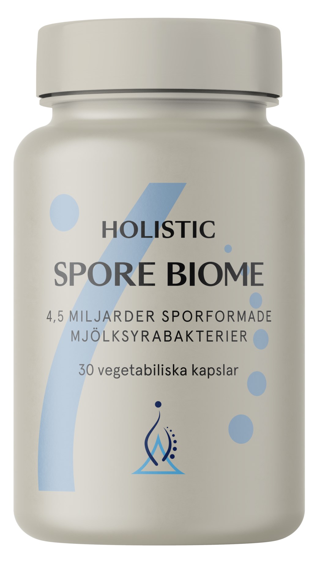Holistic Spore Biome er et effektivt tilskud med sporeformede mælkesyrebakterier. Sporeformede bakterier udgør en unik bakteriegruppe med en overlevelsesgrad på 100% til tyktarmen, hvilket adskiller dem fra almindelige mælkesyrebakterier, som ikke altid når tyktarmen af forskellige årsager. Sporeformede bakterier bidrager også til at skabe helt nye bakterier i tarmen. En million sporebakterier har potentiale til at generere hele 30 milliarder nye bakterier i tyktarmen. De har også evnen til at være i en hvilende tilstand og tåle ekstreme miljøer, indtil de når det passende miljø. Dette betyder, at der ikke er behov for specielle kapsler til at beskytte dem mod mavesyre. Desuden har du mulighed for nemt at åbne kapslen og blande dens indhold med mad eller drikke.